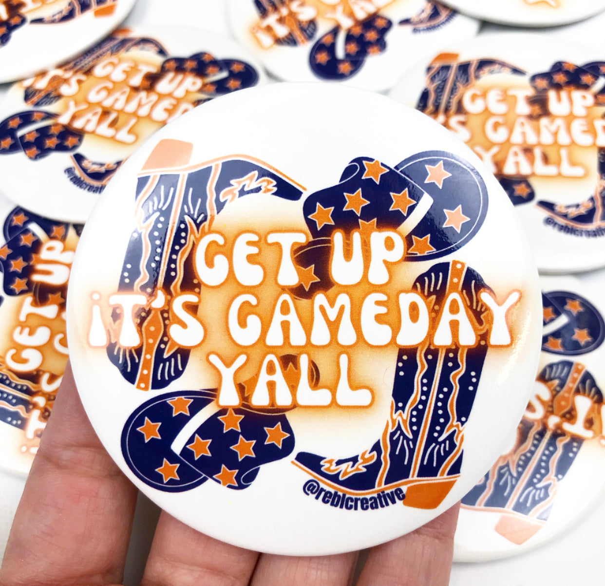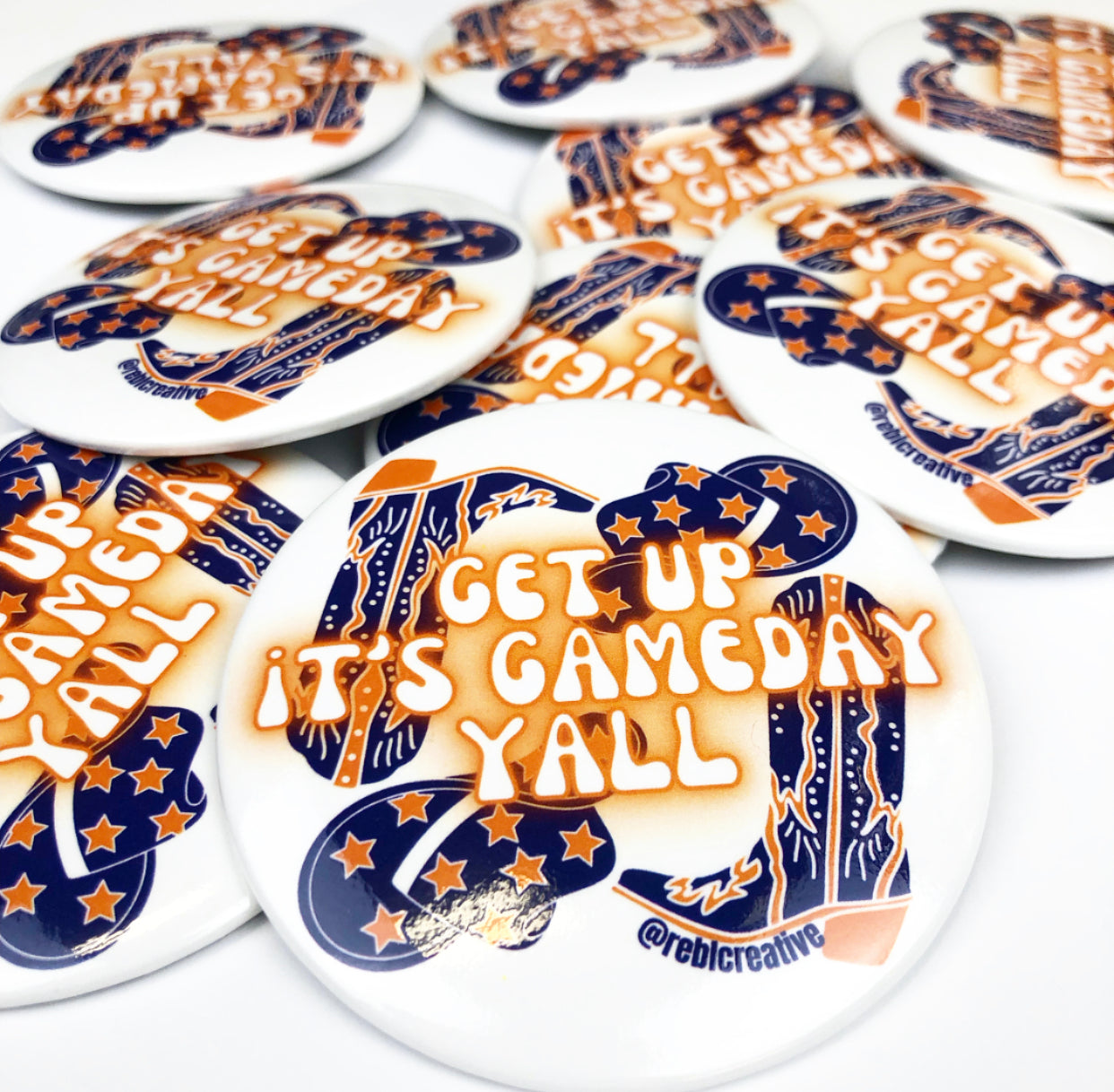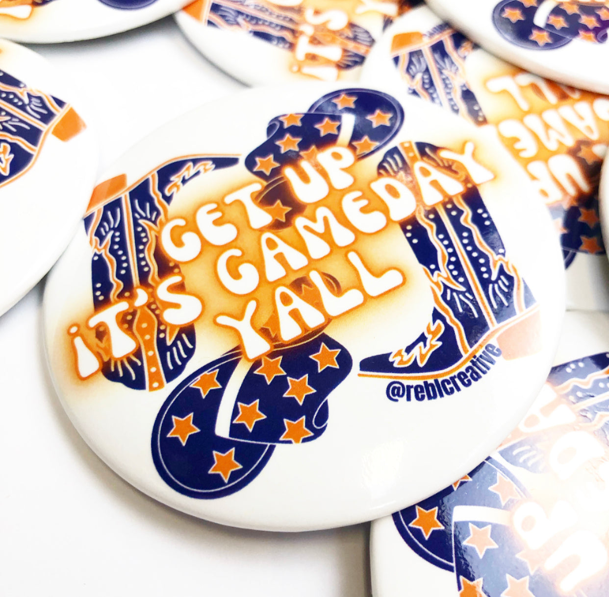 Each pin back button is 3 inches in diameter. These buttons are super lightweight and perfect for Game Day! Add to your outfit or a purse strap to complete your game day look. Each button is finished with a plastic coating to keep your button clean from any game day activities!