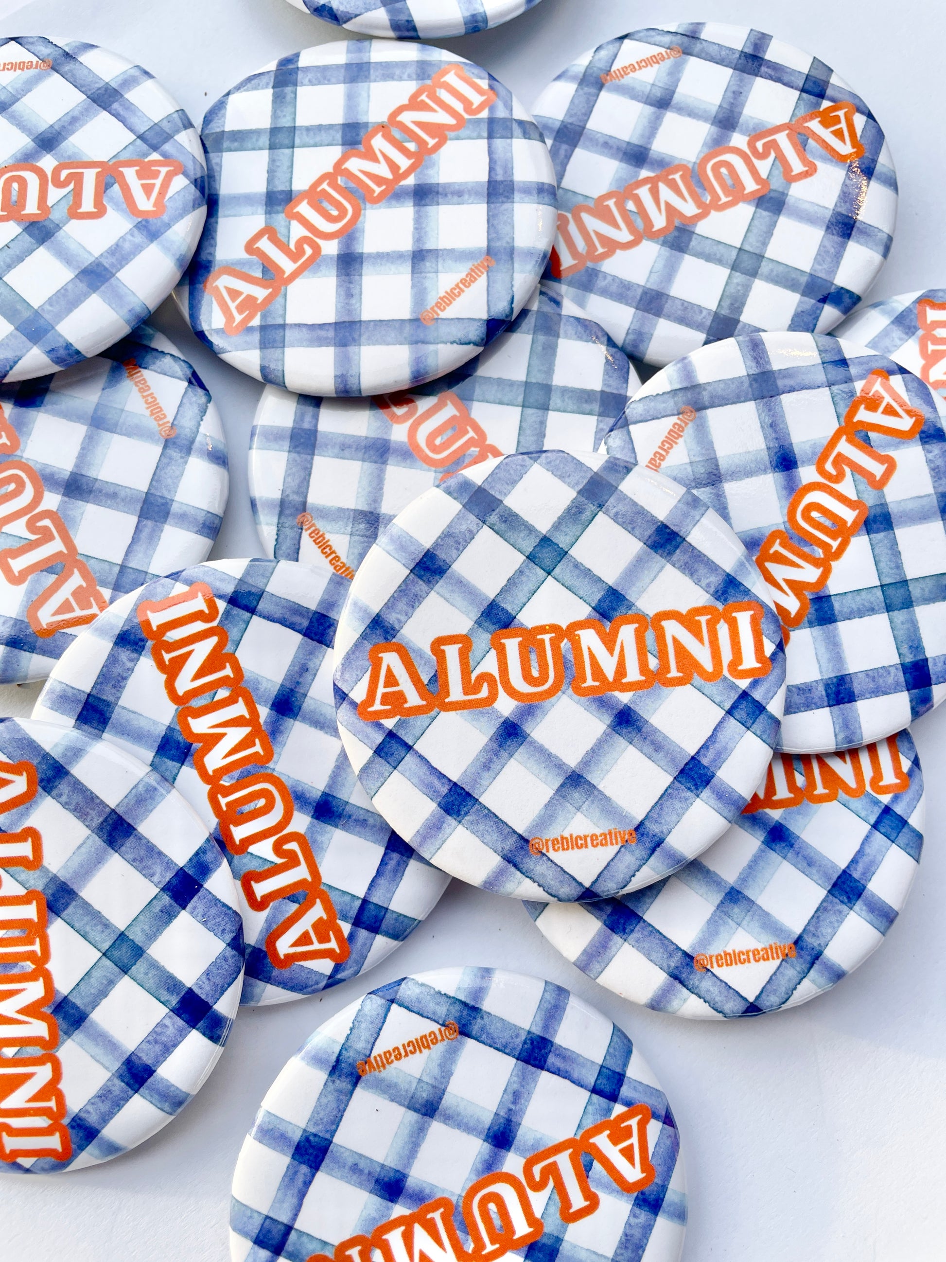 Each pin back button is 2.25 inches in diameter. These buttons are super lightweight and perfect for Game Day! Add to your outfit or a purse strap to complete your game day look. Each button is finished with a plastic coating to keep your button clean from any game day activities!