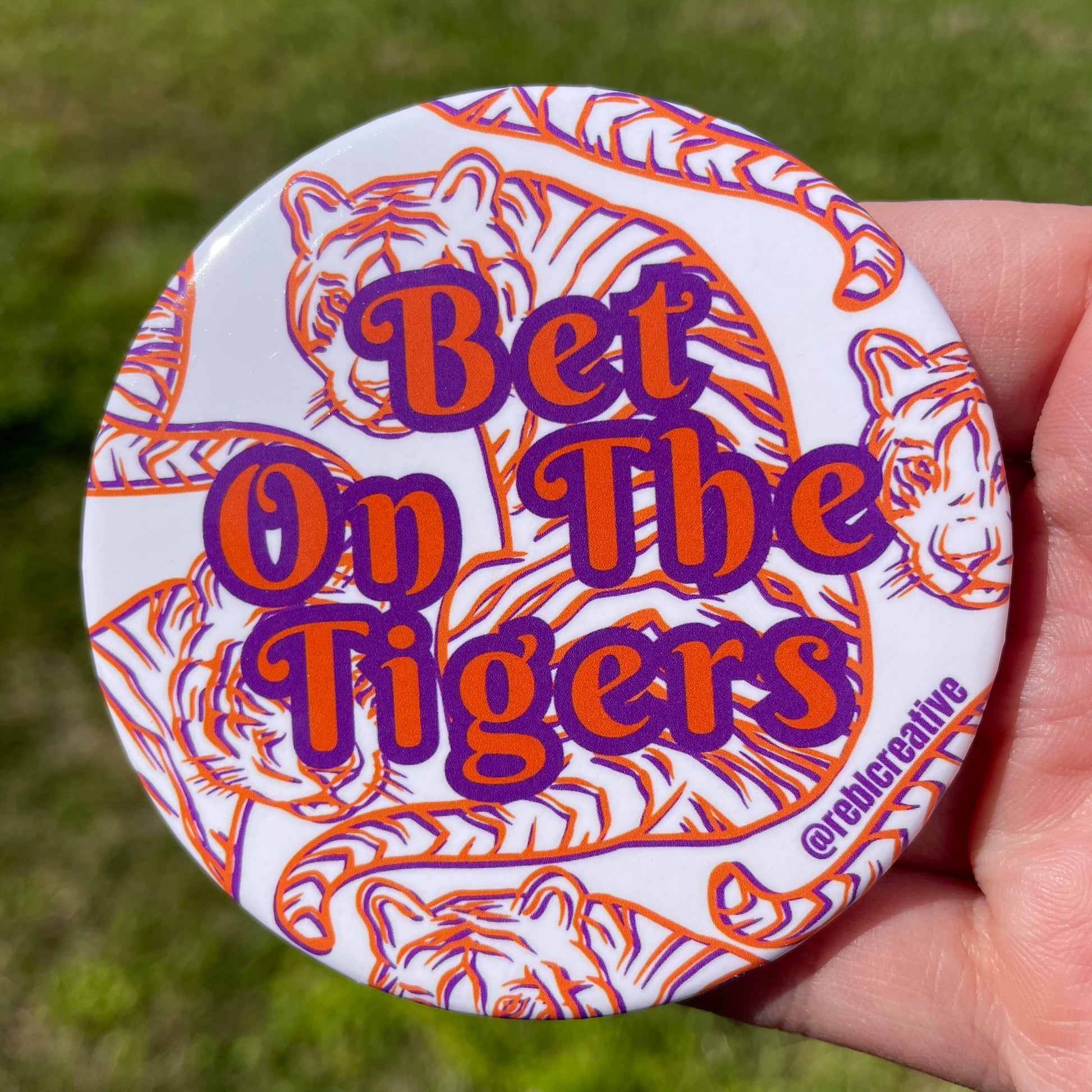 Each pin back button is 3 inches in diameter. These buttons are super lightweight and perfect for Game Day! Add to your outfit or a purse strap to complete your game day look. Each button is finished with a plastic coating to keep your button clean from any game day activities!