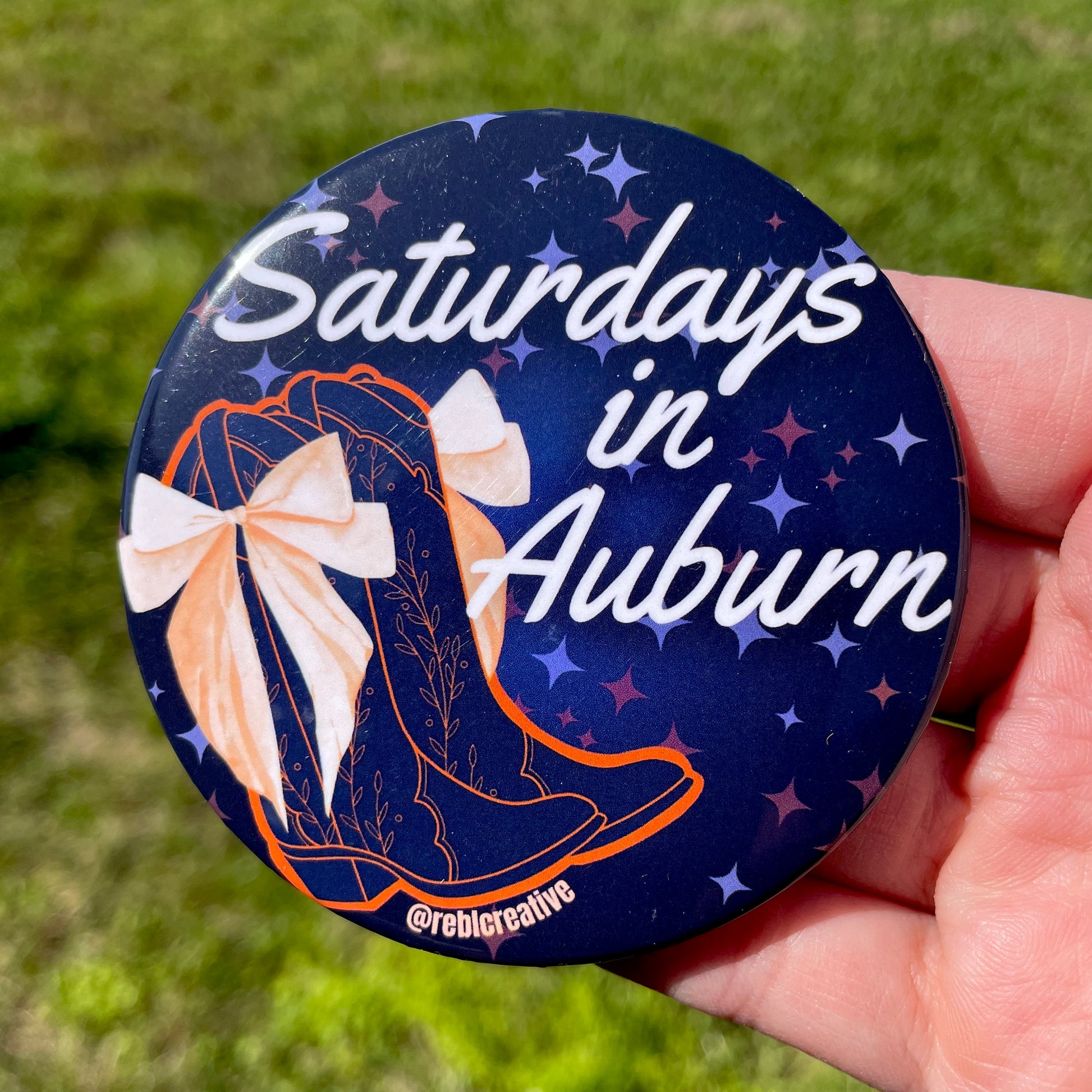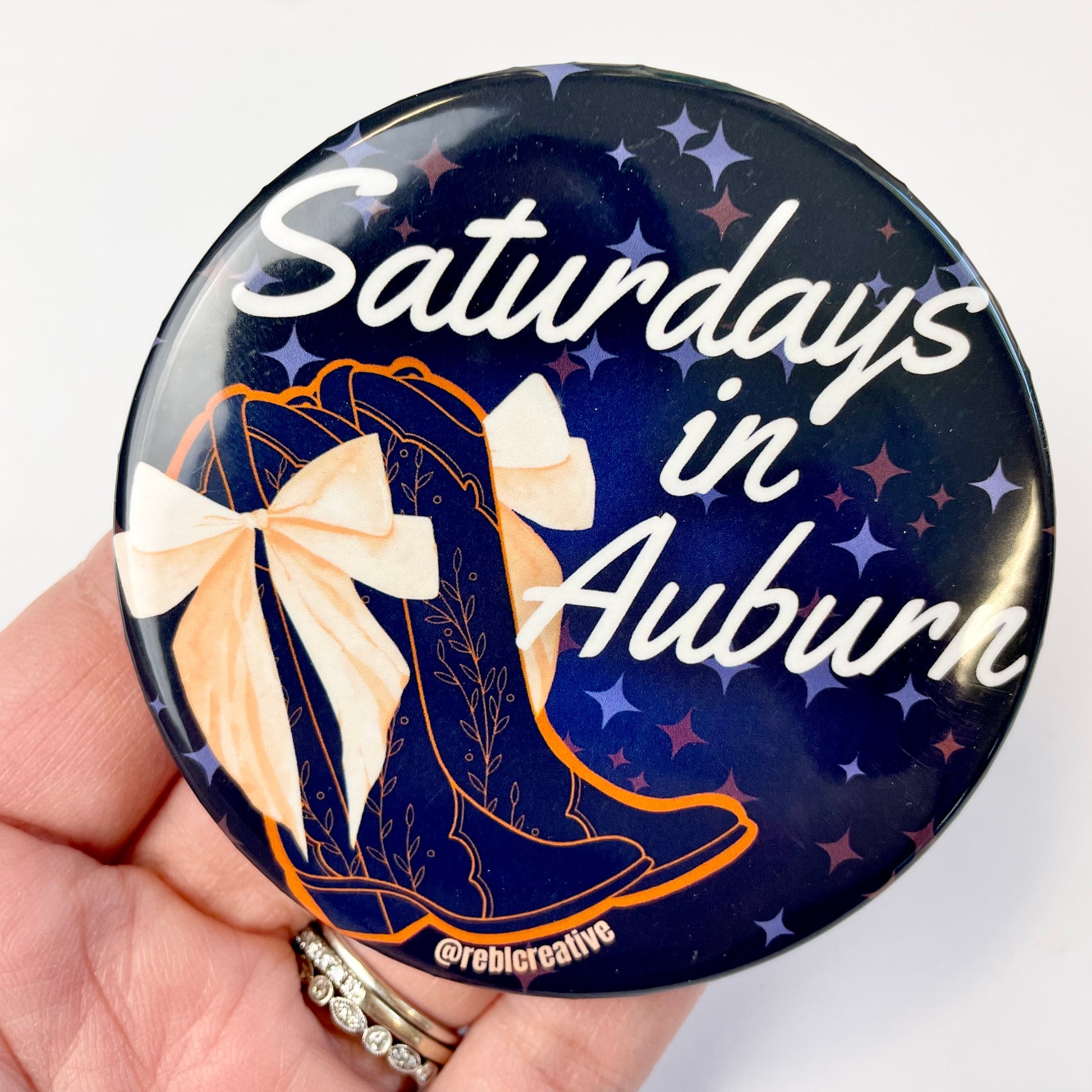 Each pin back button is 2.25 inches in diameter. These buttons are super lightweight and perfect for Game Day! Add to your outfit or a purse strap to complete your game day look. Each button is finished with a plastic coating to keep your button clean from any game day activities!