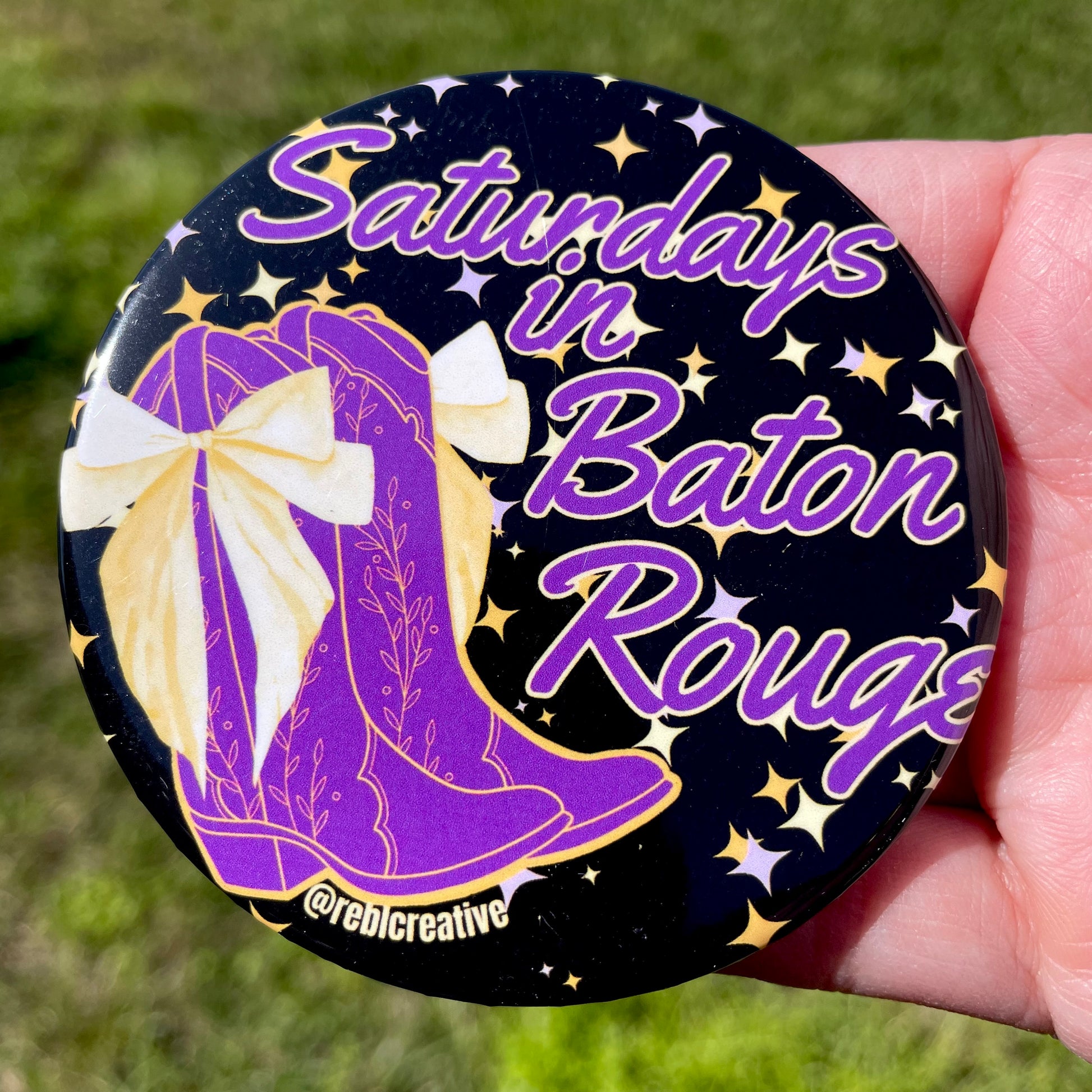 Each pin back button is 2.25 inches in diameter. These buttons are super lightweight and perfect for Game Day! Add to your outfit or a purse strap to complete your game day look. Each button is finished with a plastic coating to keep your button clean from any game day activities!