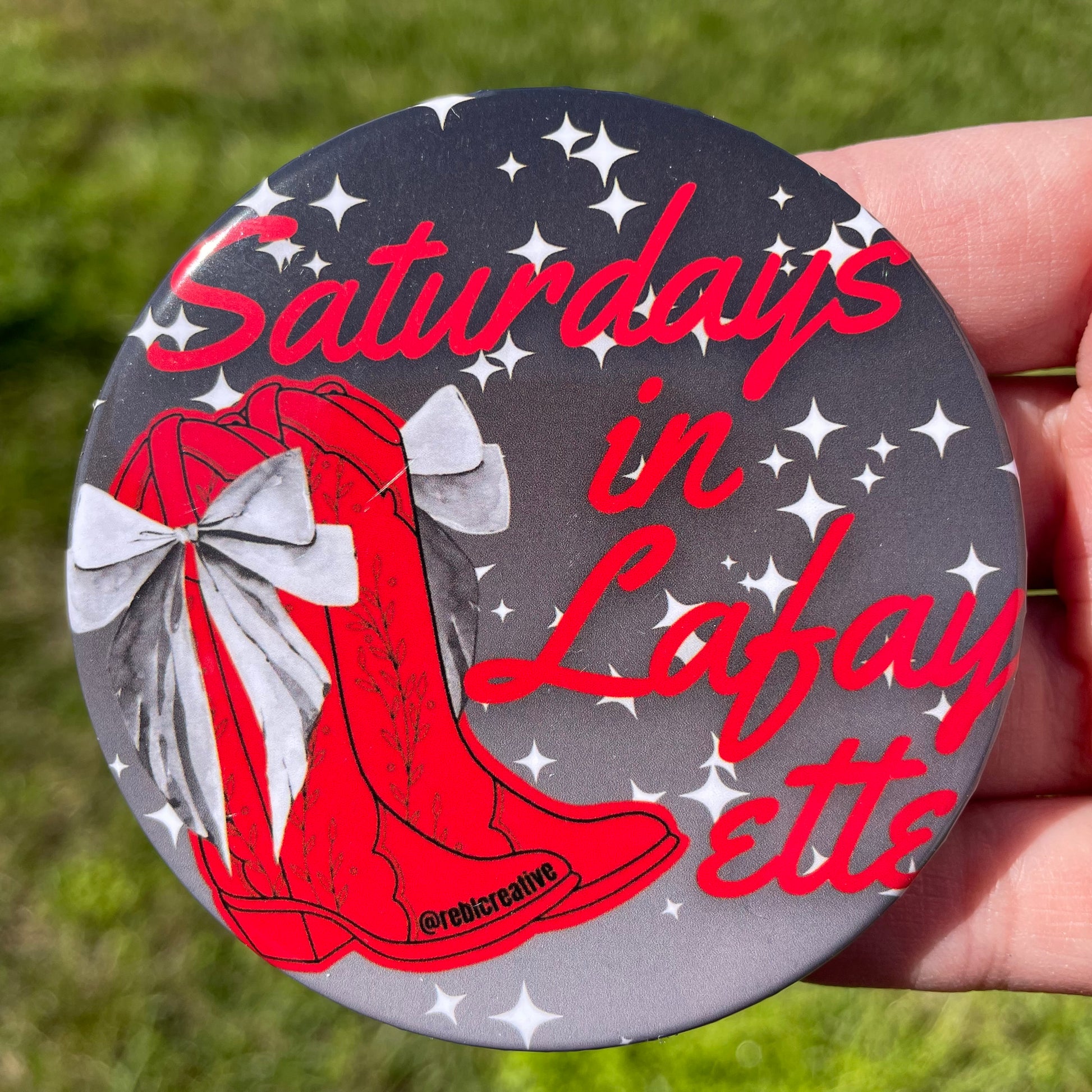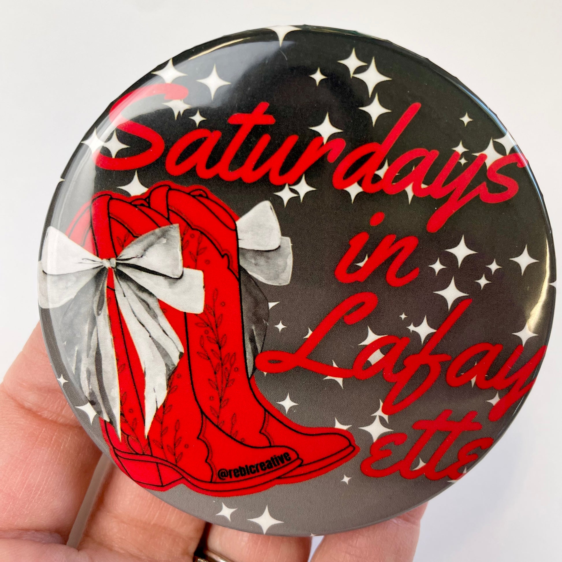 Each pin back button is 3 inches in diameter. These buttons are super lightweight and perfect for Game Day! Add to your outfit or a purse strap to complete your game day look. Each button is finished with a plastic coating to keep your button clean from any game day activities!