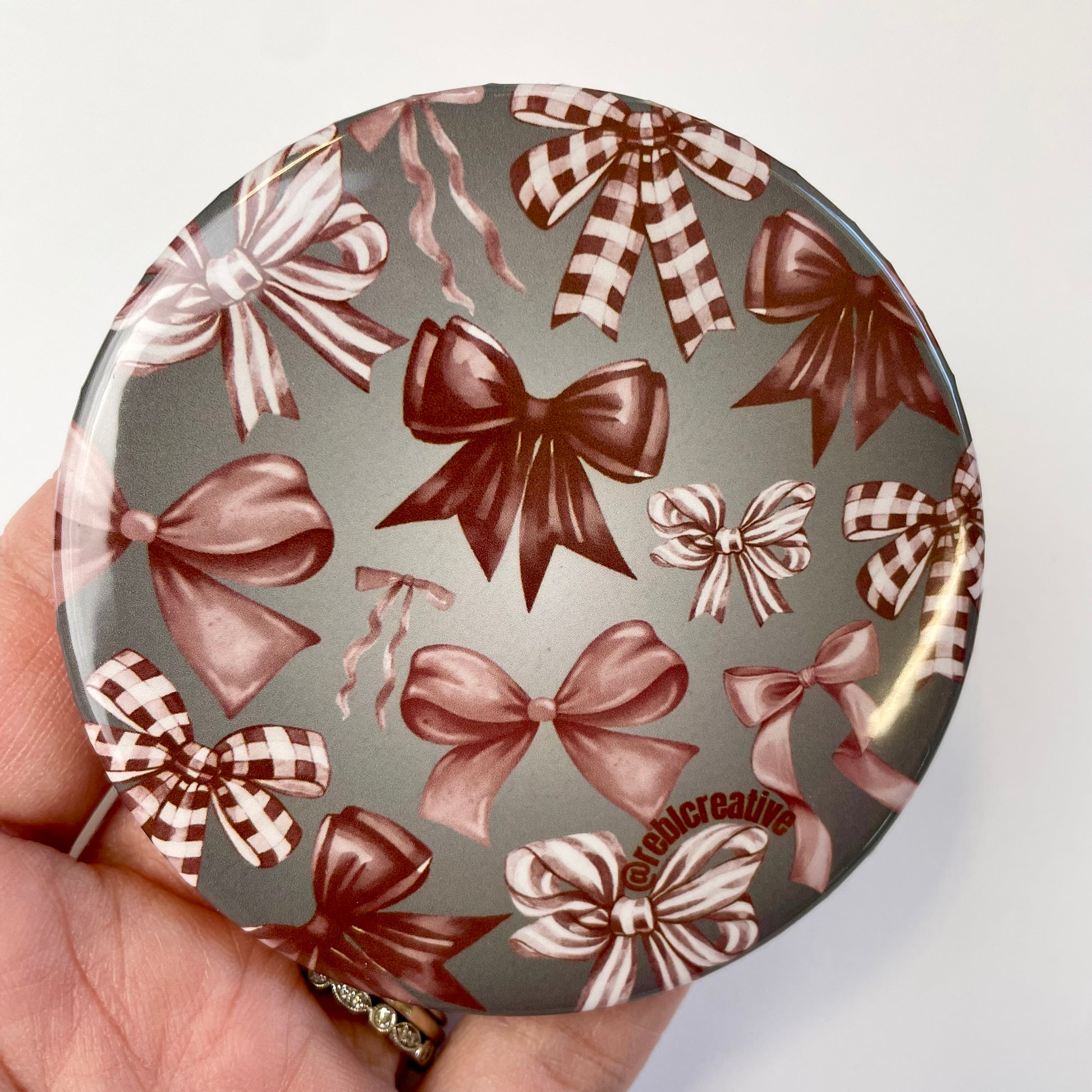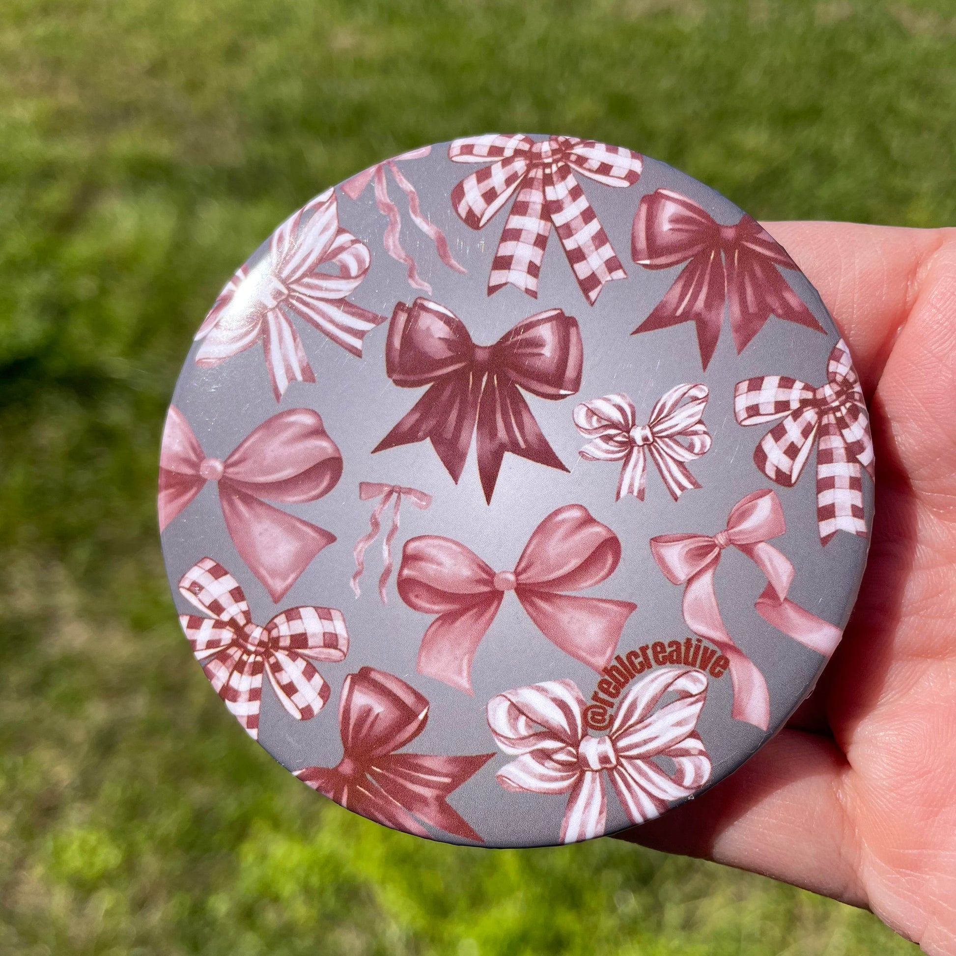 Each pin back button is 2.25 inches in diameter. These buttons are super lightweight and perfect for Game Day! Add to your outfit or a purse strap to complete your game day look. Each button is finished with a plastic coating to keep your button clean from any game day activities!