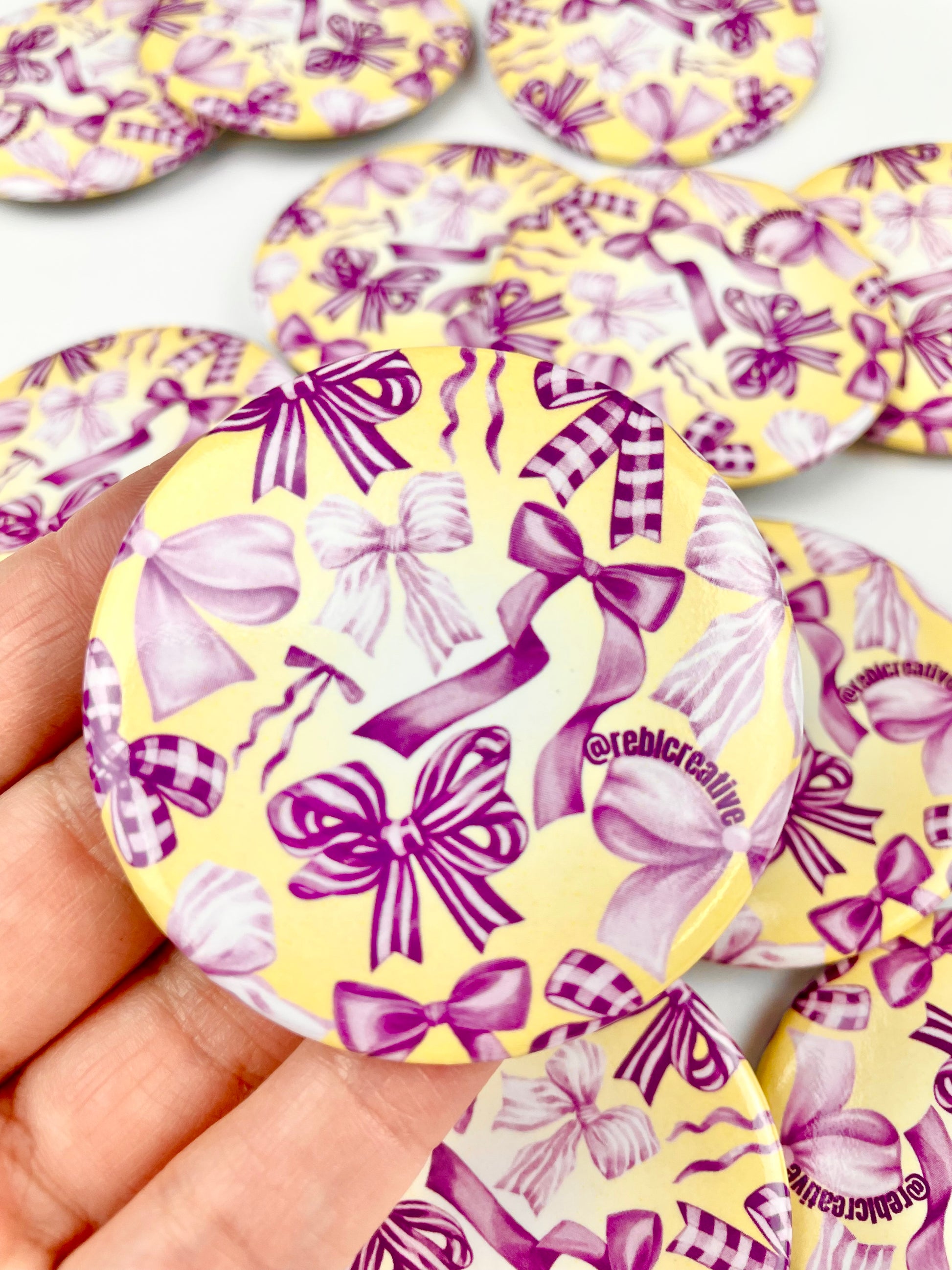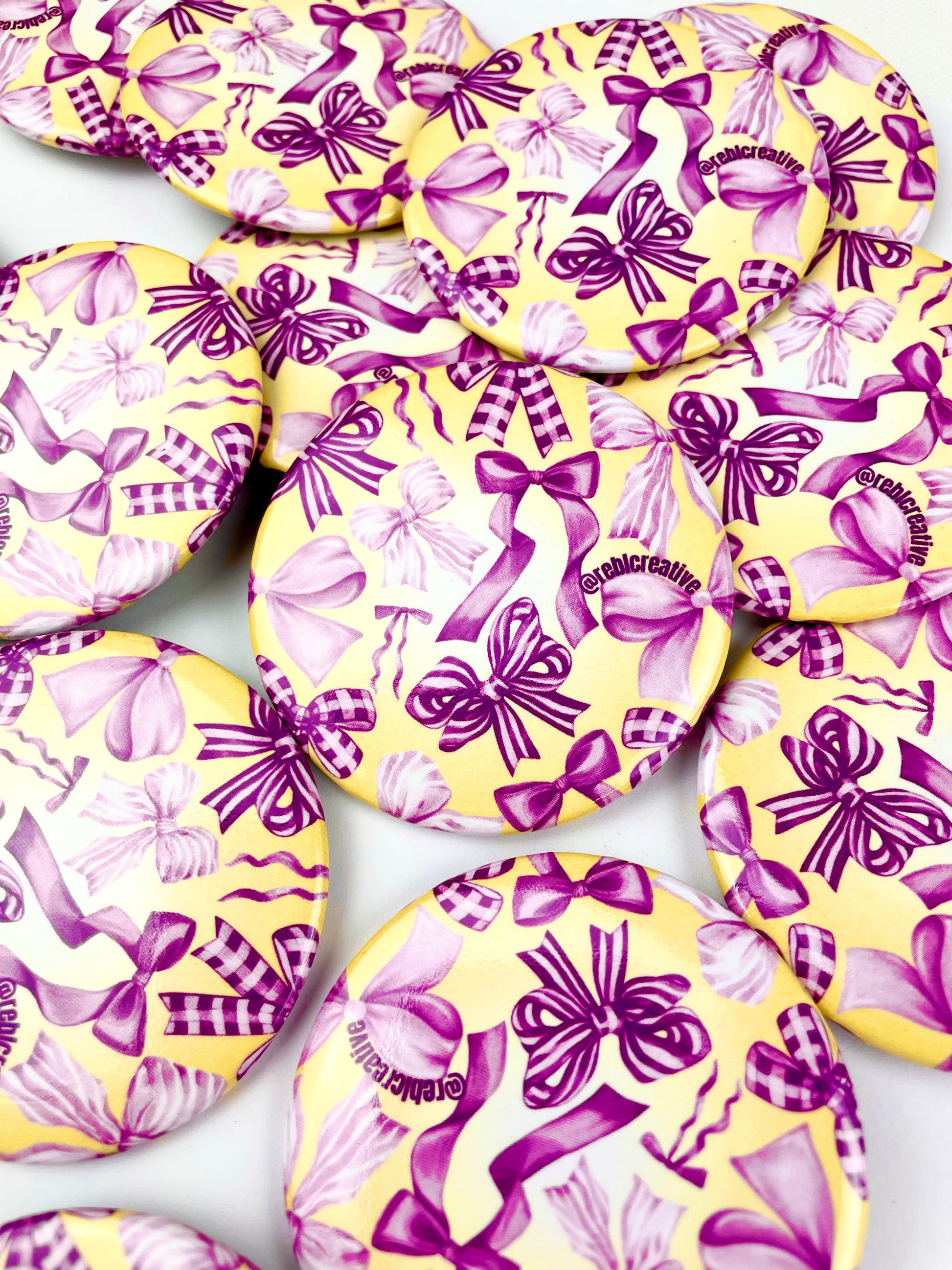 Each pin back button is 2.25 inches in diameter. These buttons are super lightweight and perfect for Game Day! Add to your outfit or a purse strap to complete your game day look. Each button is finished with a plastic coating to keep your button clean from any game day activities!