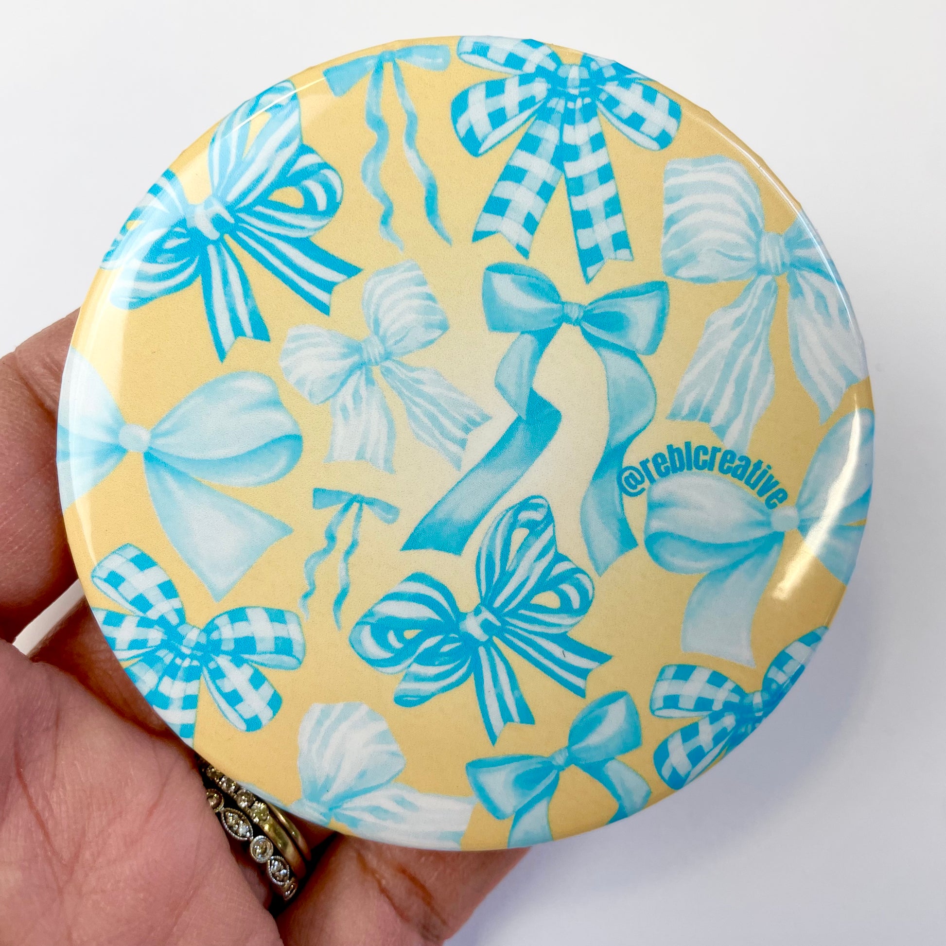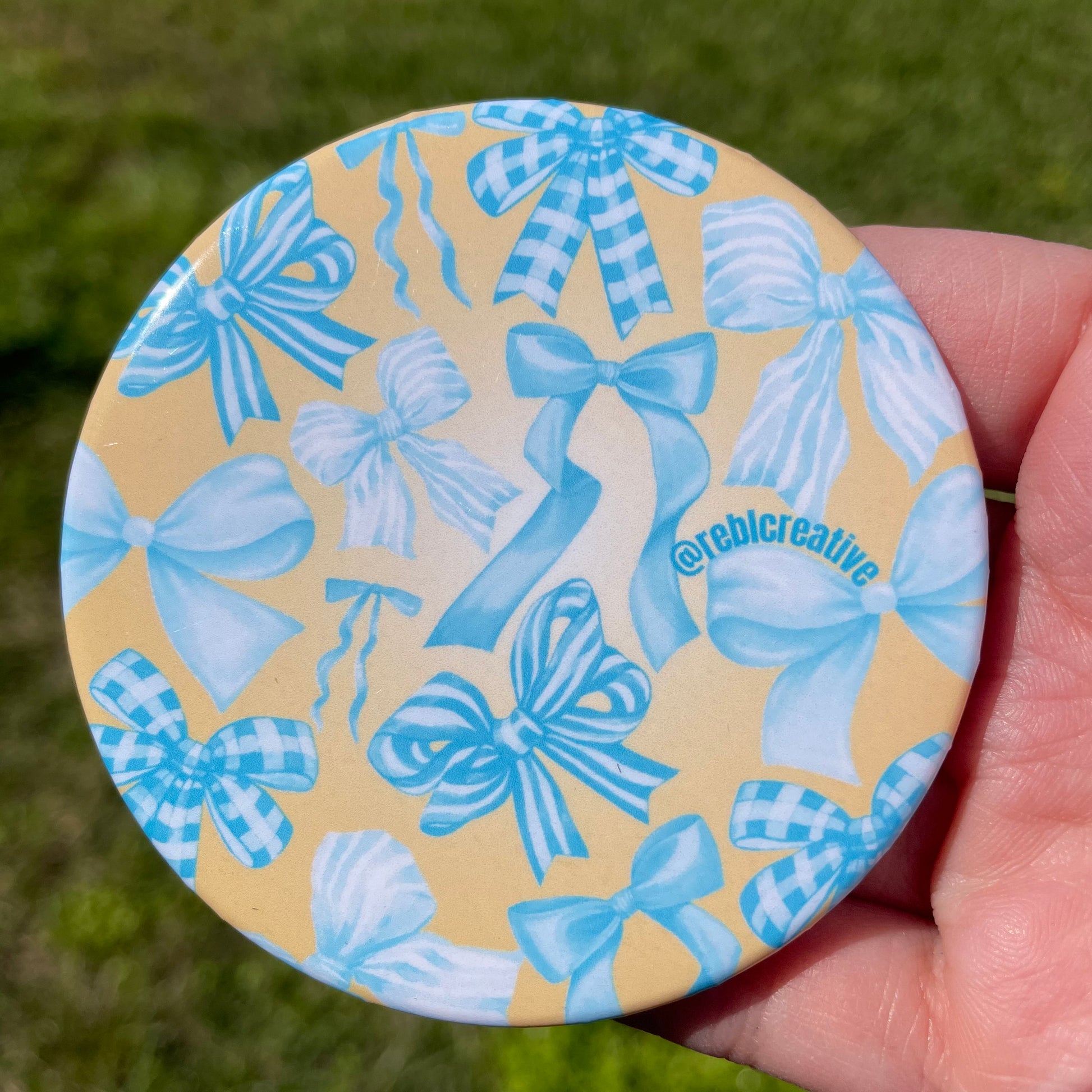 Each pin back button is 2.25 inches in diameter. These buttons are super lightweight and perfect for Game Day! Add to your outfit or a purse strap to complete your game day look. Each button is finished with a plastic coating to keep your button clean from any game day activities!