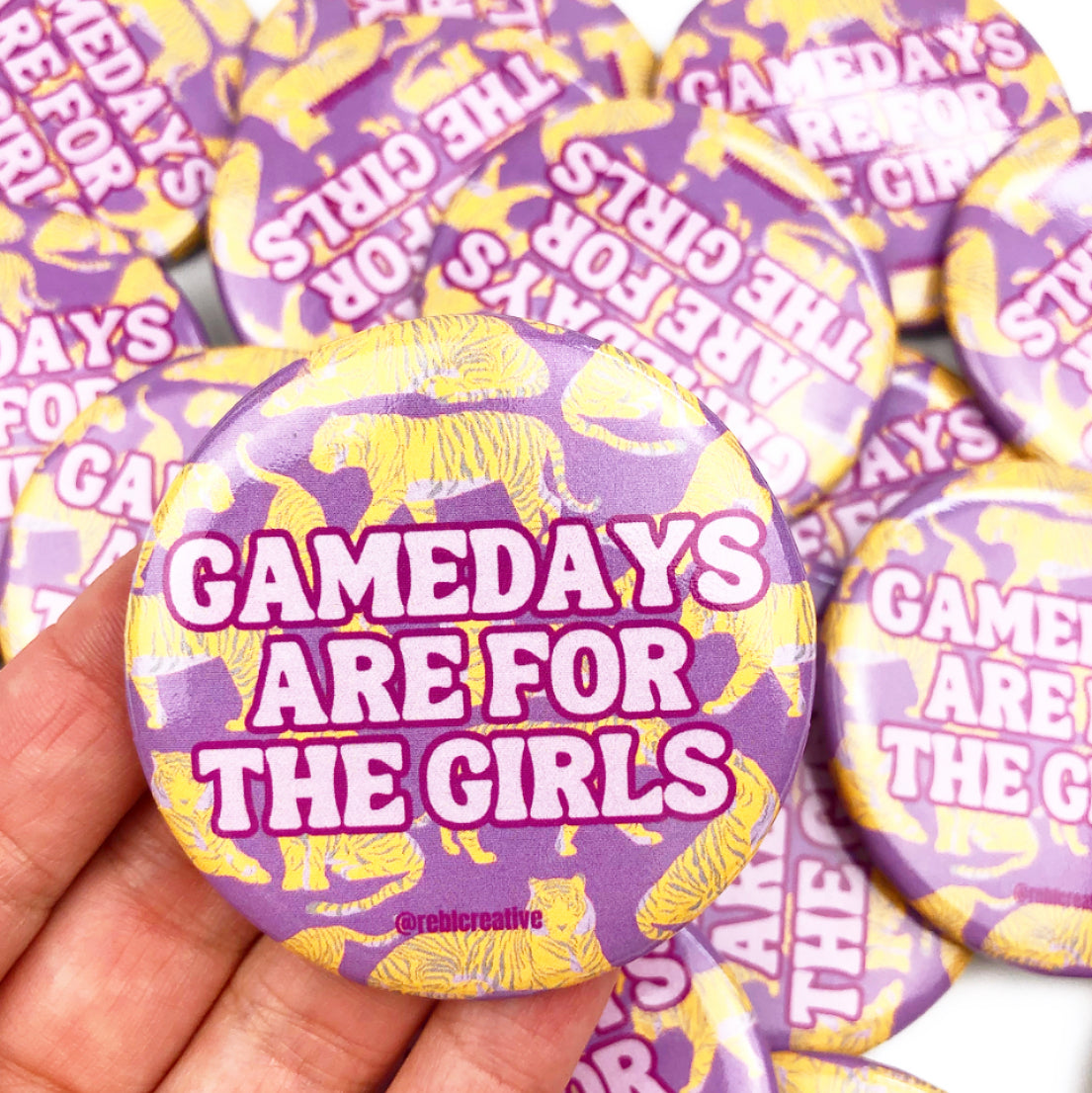 Each pin back button is 2.25 inches in diameter. These buttons are super lightweight and perfect for Game Day! Add to your outfit or a purse strap to complete your game day look. Each button is finished with a plastic coating to keep your button clean from any game day activities!