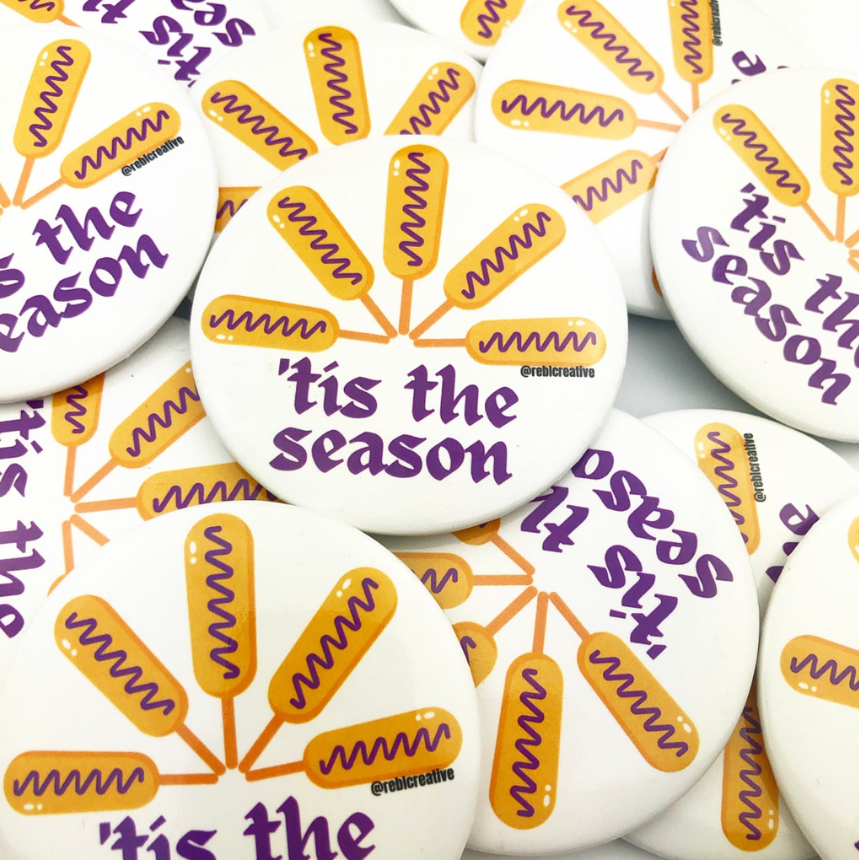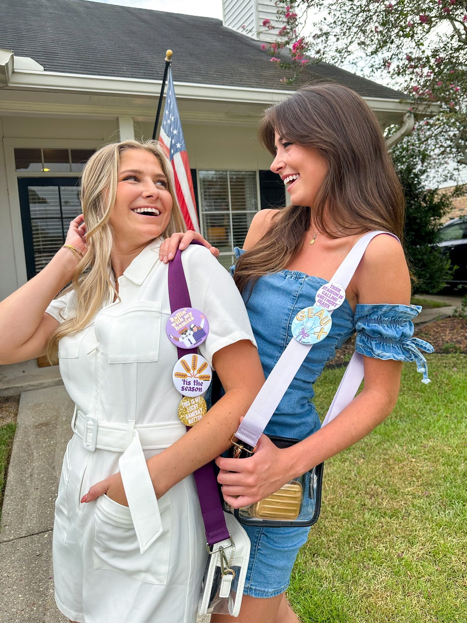 Each pin back button is 3 inches in diameter. These buttons are super lightweight and perfect for Game Day! Add to your outfit or a purse strap to complete your game day look. Each button is finished with a plastic coating to keep your button clean from any game day activities!