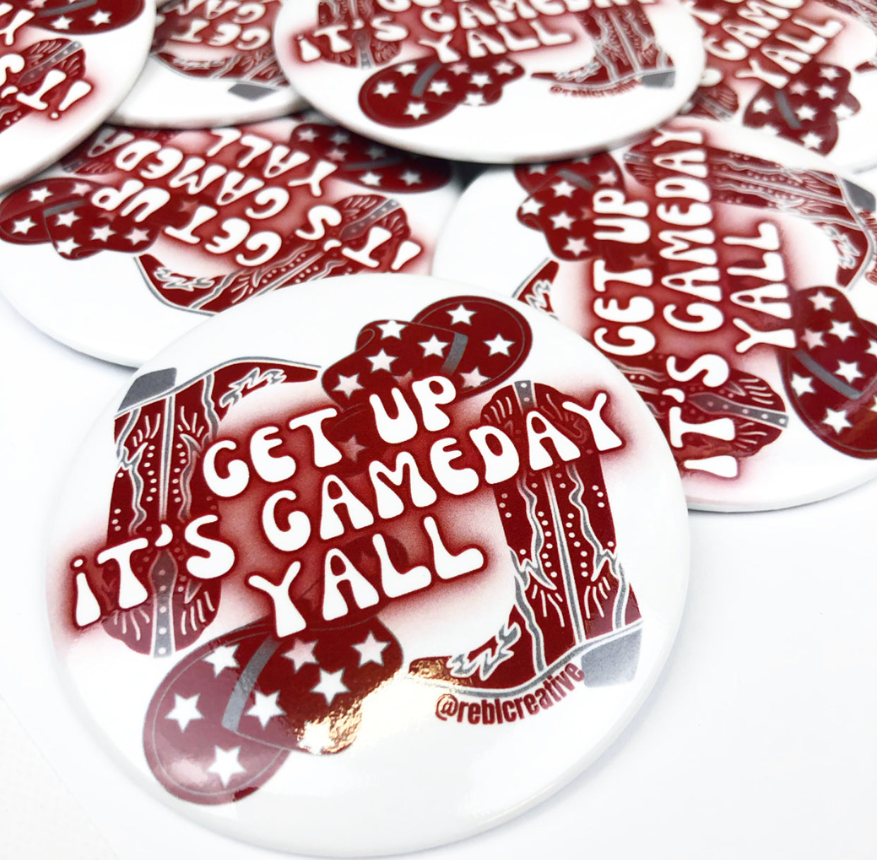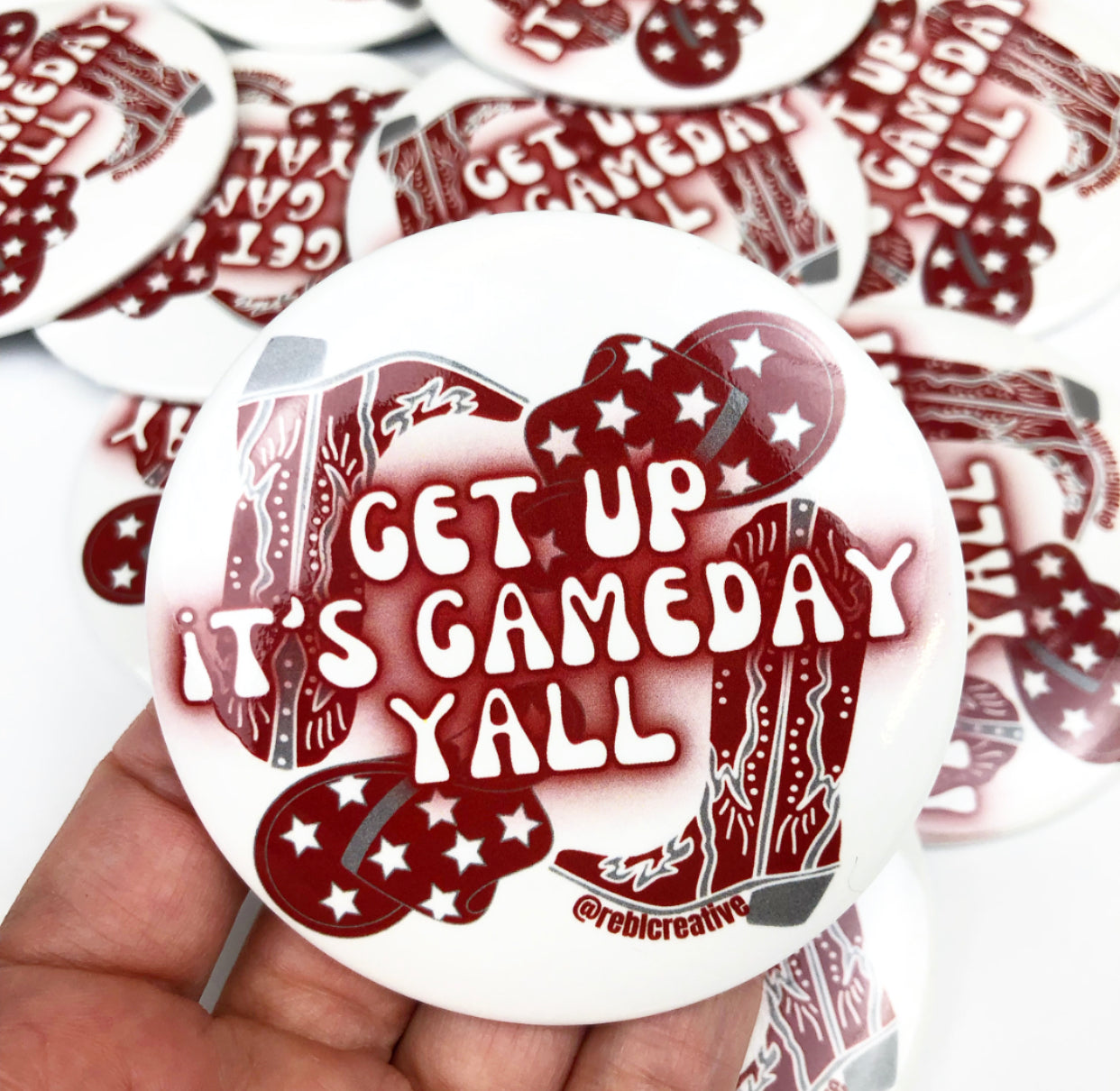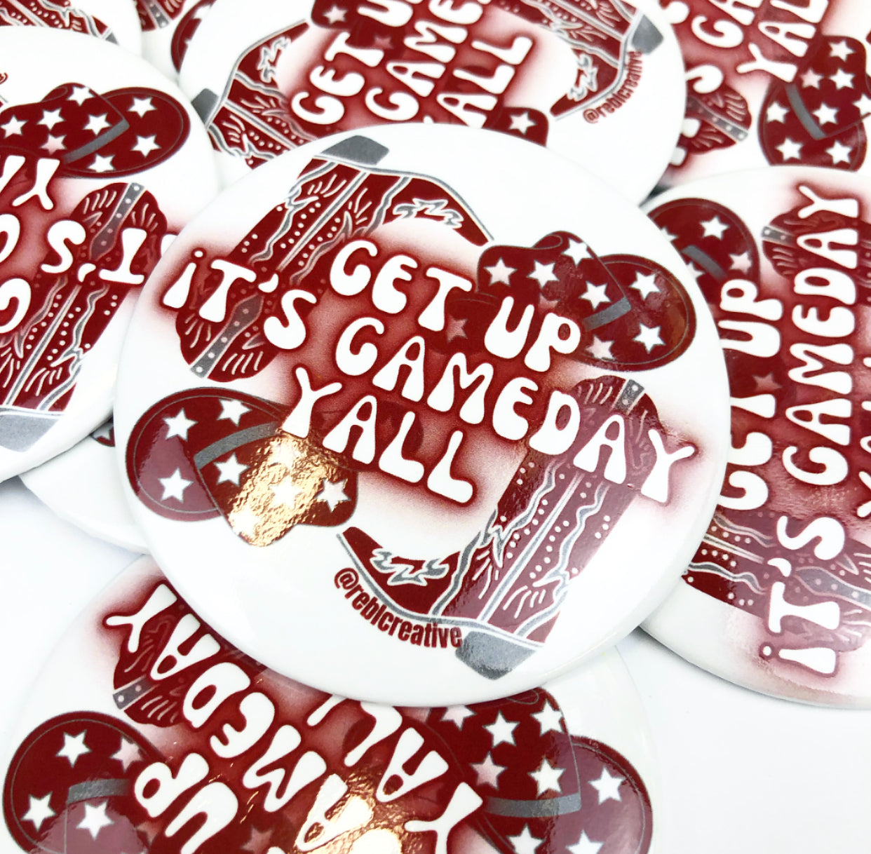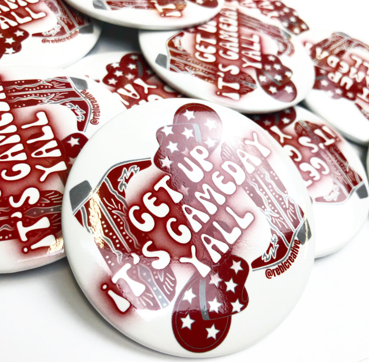 Each pin back button is 3 inches in diameter. These buttons are super lightweight and perfect for Game Day! Add to your outfit or a purse strap to complete your game day look. Each button is finished with a plastic coating to keep your button clean from any game day activities!