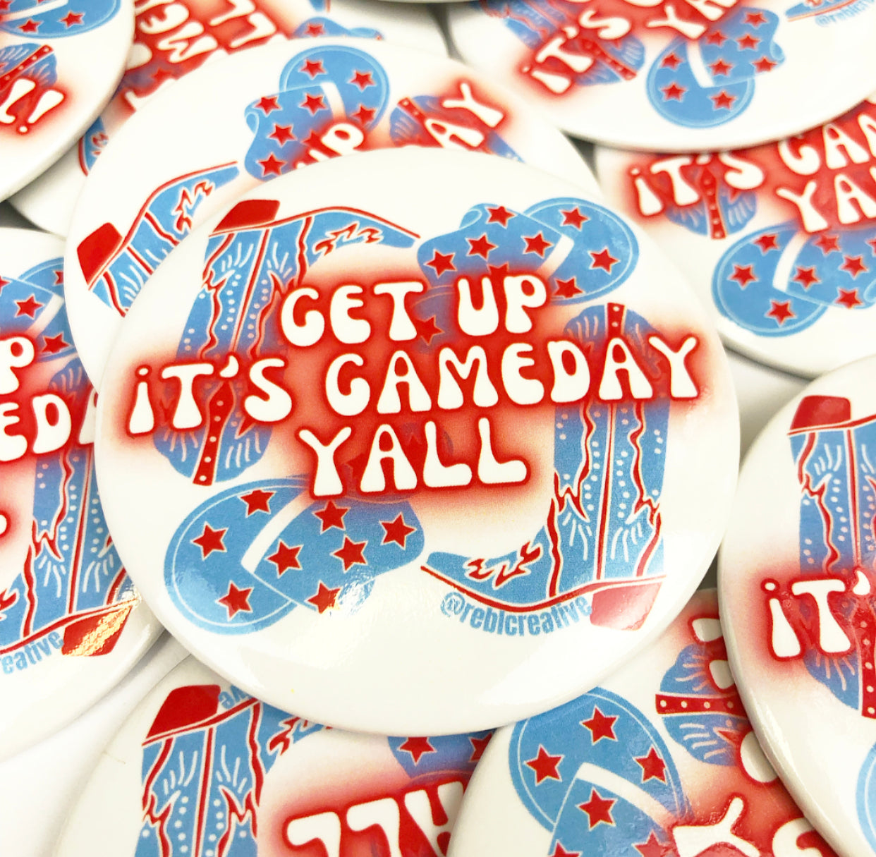 Each pin back button is 3 inches in diameter. These buttons are super lightweight and perfect for Game Day! Add to your outfit or a purse strap to complete your game day look. Each button is finished with a plastic coating to keep your button clean from any game day activities!