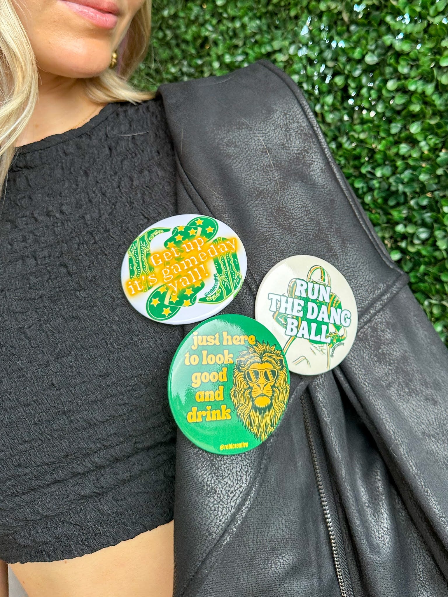 Each pin back button is 3 inches in diameter. These buttons are super lightweight and perfect for Game Day! Add to your outfit or a purse strap to complete your game day look. Each button is finished with a plastic coating to keep your button clean from any game day activities!
