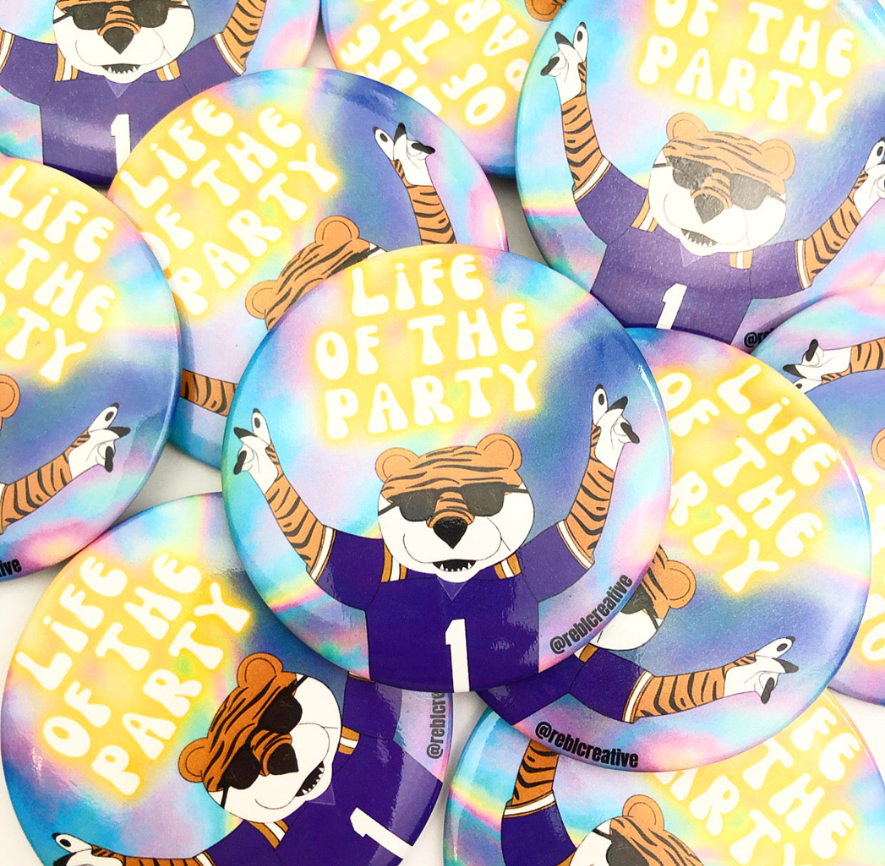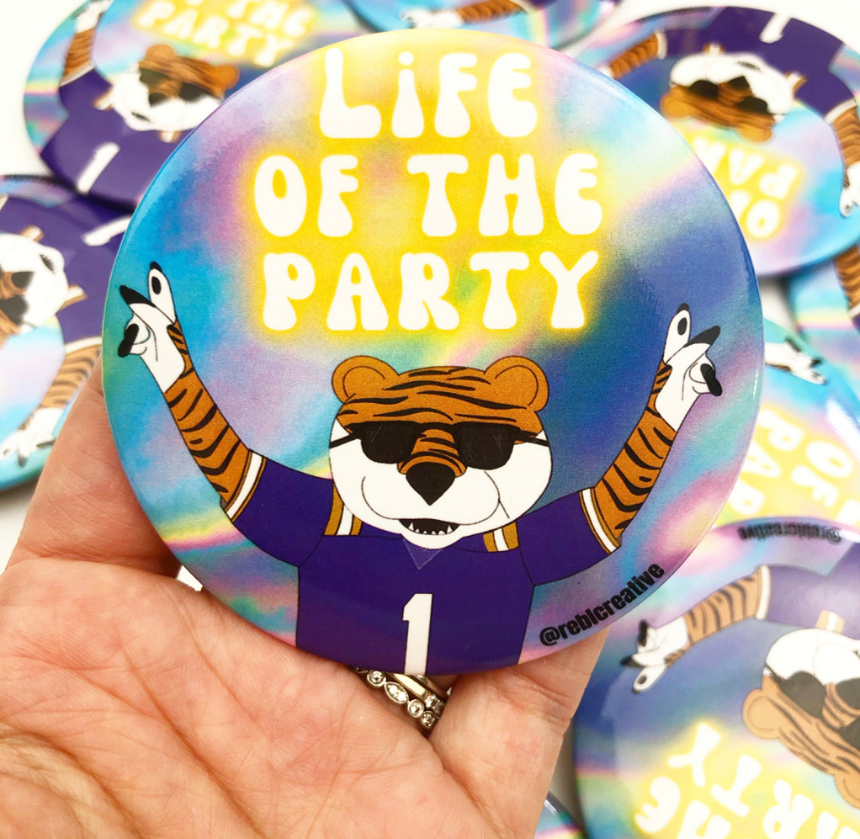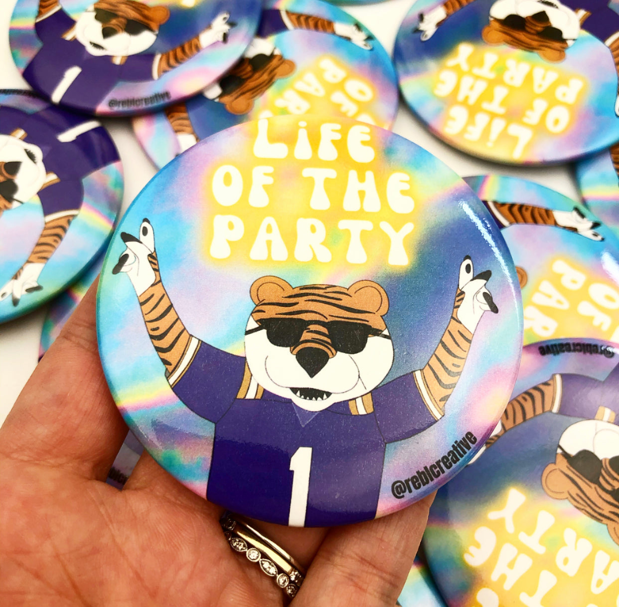 Each pin back button is 3 inches in diameter. These buttons are super lightweight and perfect for Game Day! Add to your outfit or a purse strap to complete your game day look. Each button is finished with a plastic coating to keep your button clean from any game day activities!