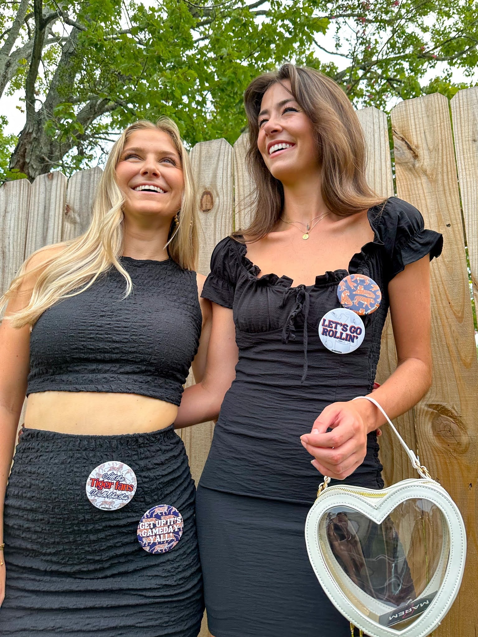 Each pin back button is 3 inches in diameter. These buttons are super lightweight and perfect for Game Day! Add to your outfit or a purse strap to complete your game day look. Each button is finished with a plastic coating to keep your button clean from any game day activities!