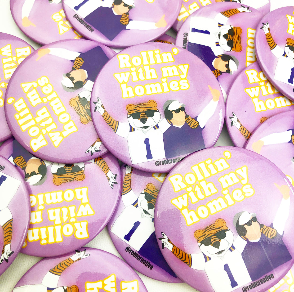 Each pin back button is 3 inches in diameter. These buttons are super lightweight and perfect for Game Day! Add to your outfit or a purse strap to complete your game day look. Each button is finished with a plastic coating to keep your button clean from any game day activities!