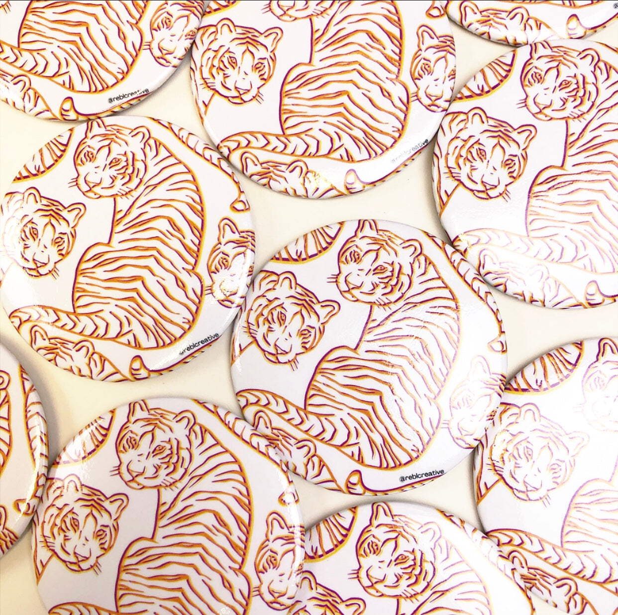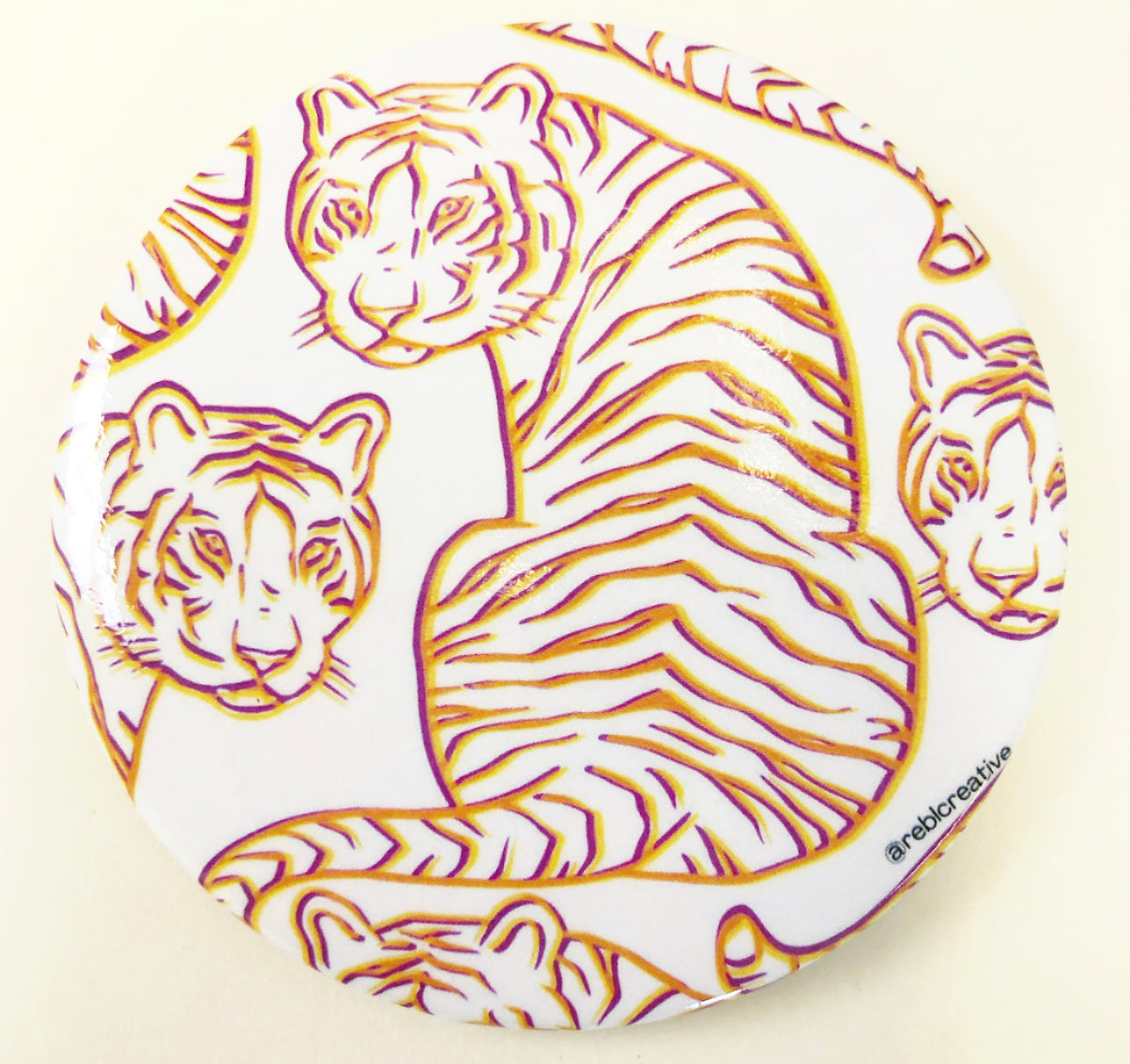 Each pin back button is 3 inches in diameter. These buttons are super lightweight and perfect for Game Day! Add to your outfit or a purse strap to complete your game day look. Each button is finished with a plastic coating to keep your button clean from any game day activities!