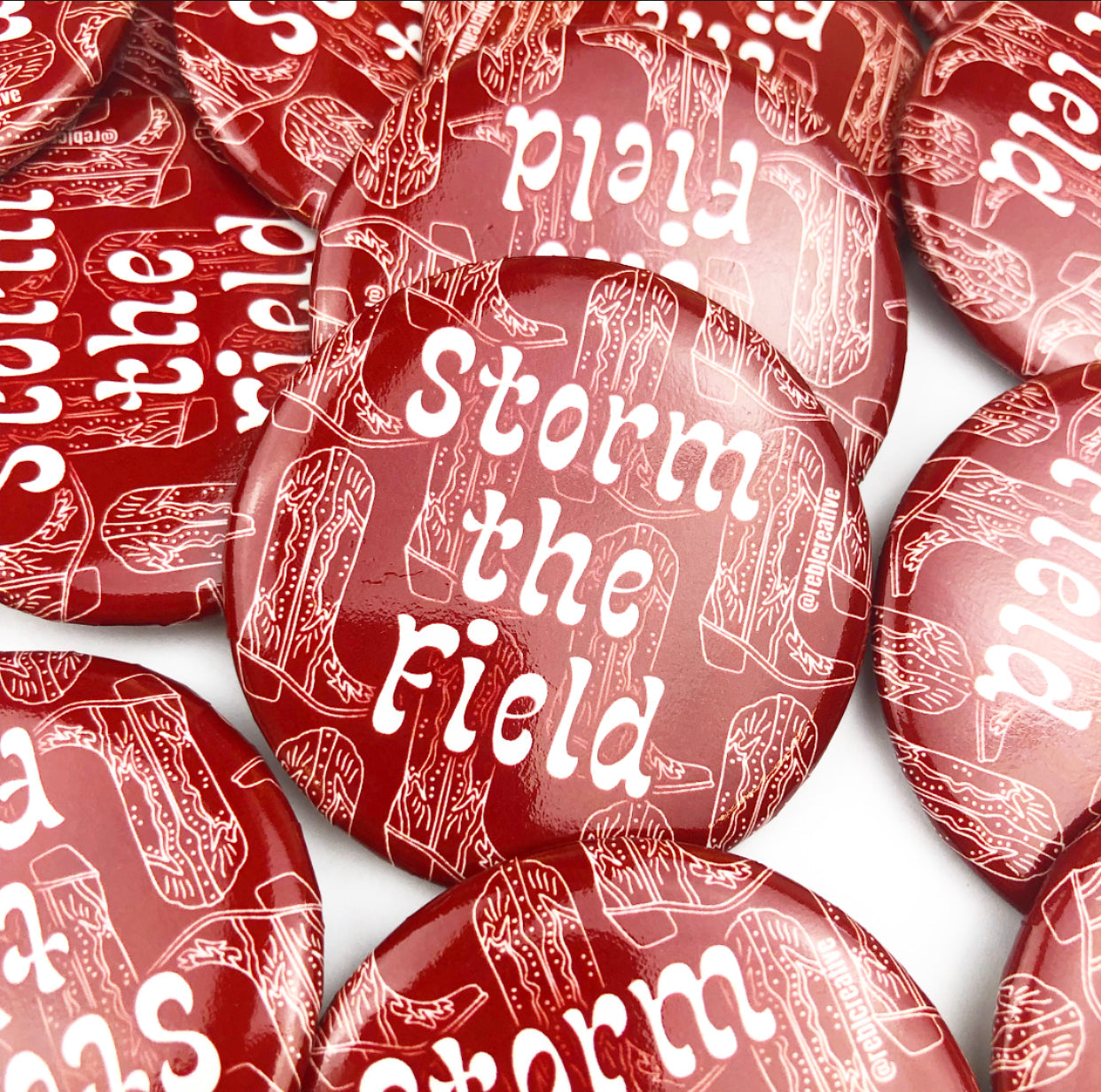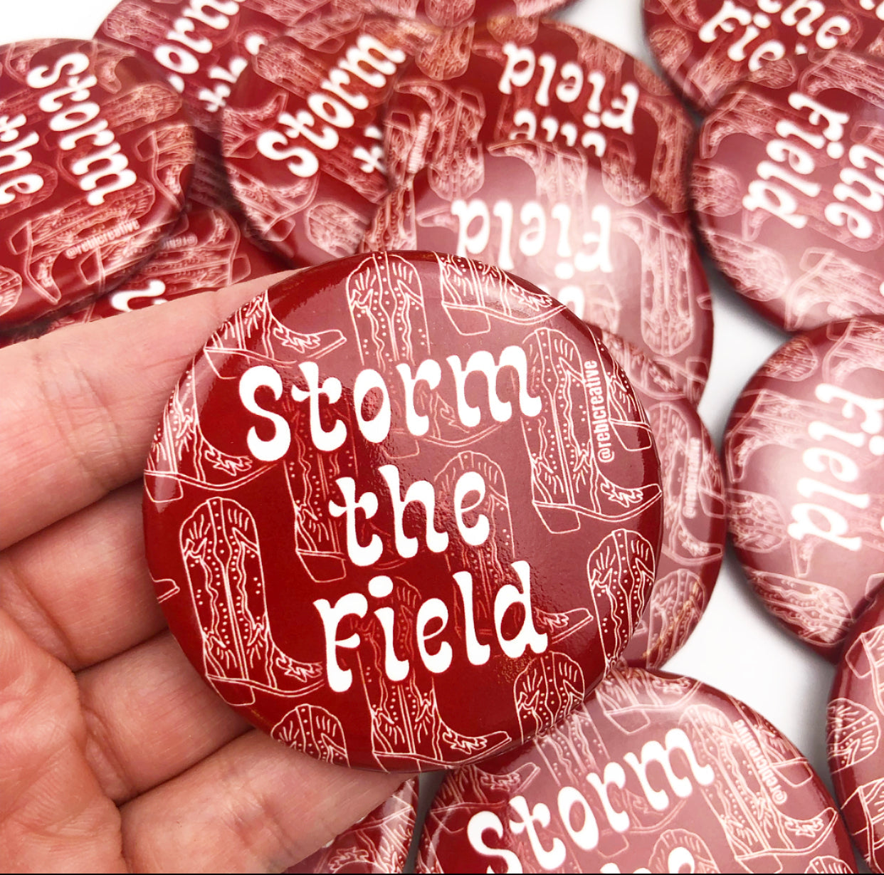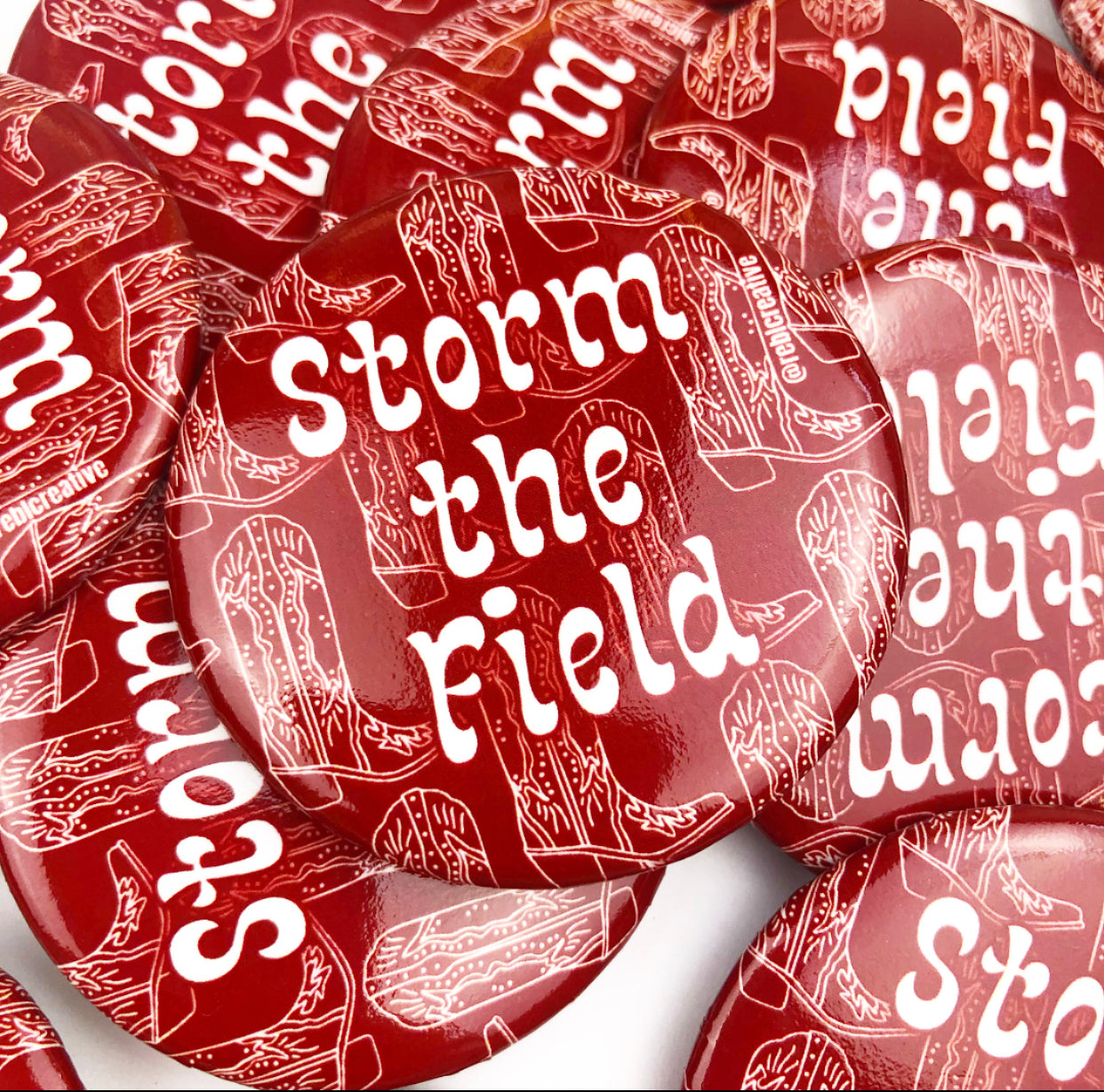 Each pin back button is 2.25 inches in diameter. These buttons are super lightweight and perfect for Game Day! Add to your outfit or a purse strap to complete your game day look. Each button is finished with a plastic coating to keep your button clean from any game day activities!