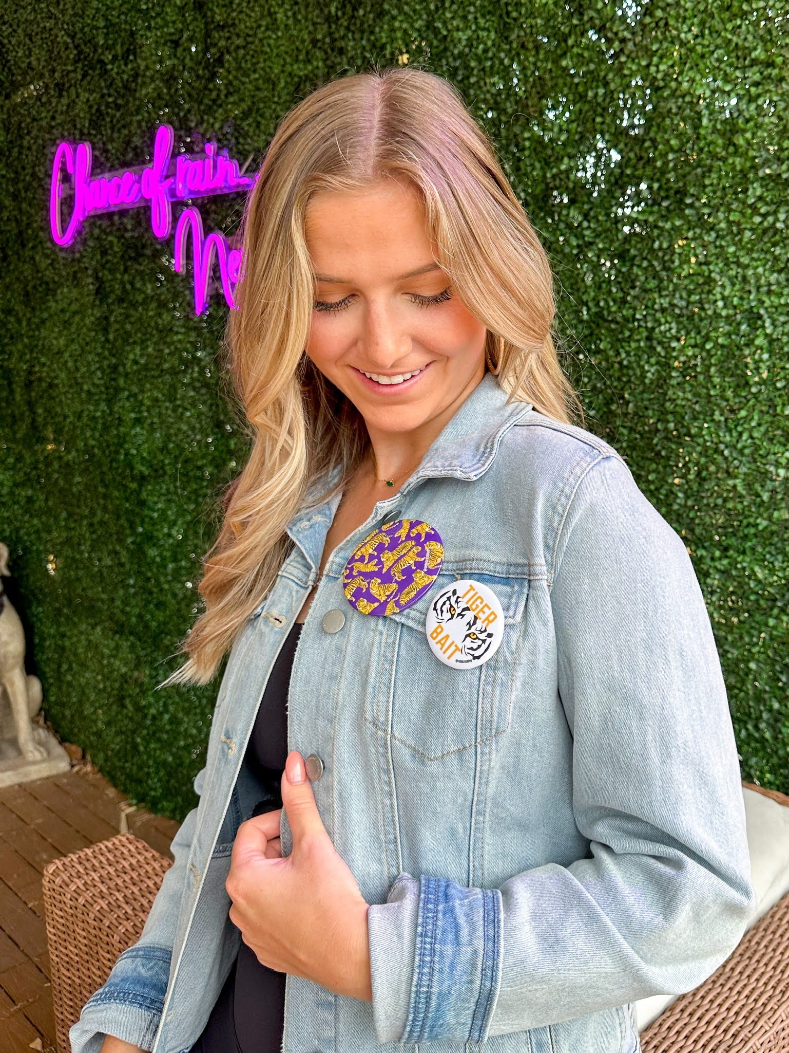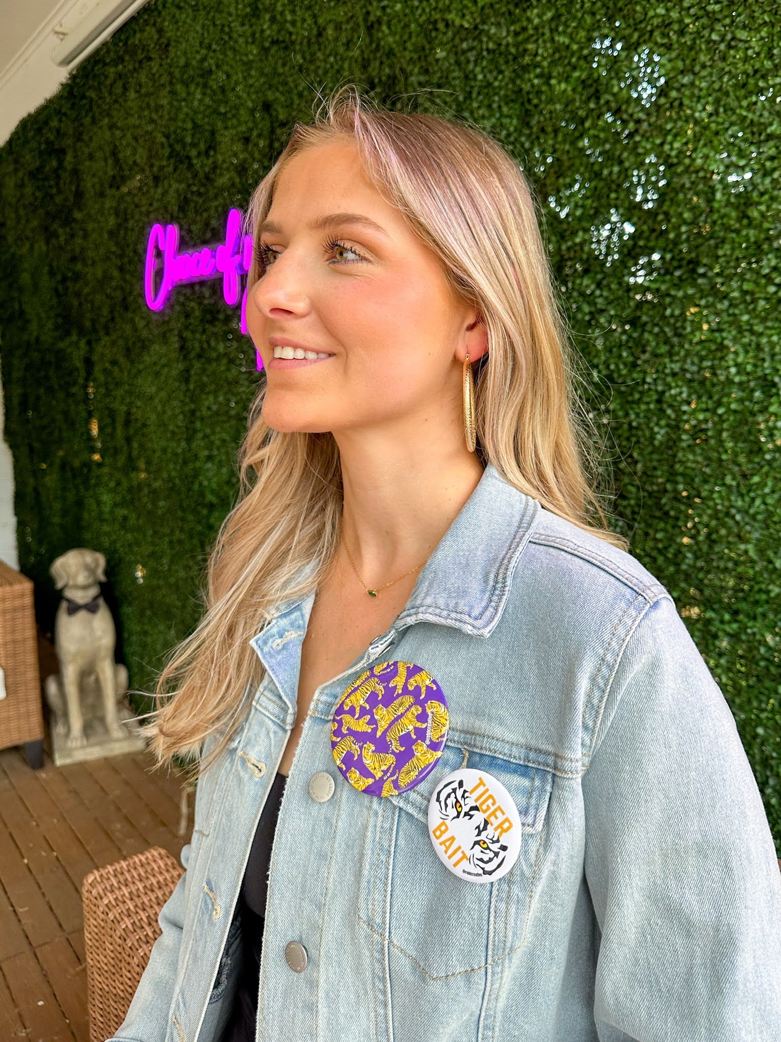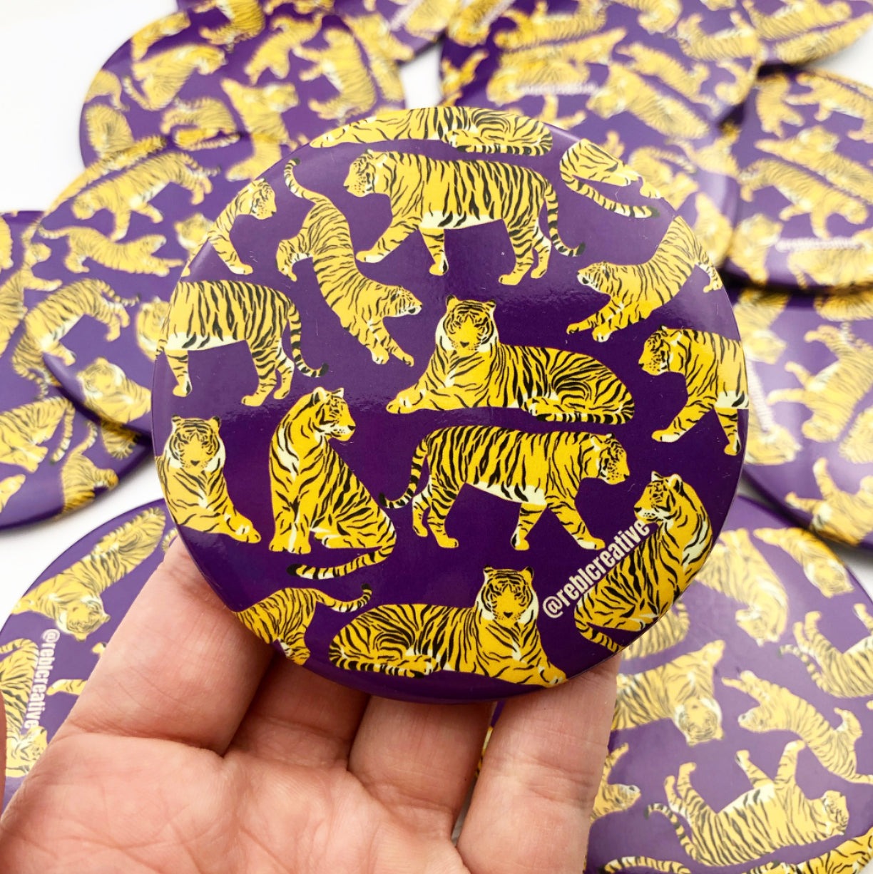 Each pin back button is 3 inches in diameter. These buttons are super lightweight and perfect for Game Day! Add to your outfit or a purse strap to complete your game day look. Each button is finished with a plastic coating to keep your button clean from any game day activities!