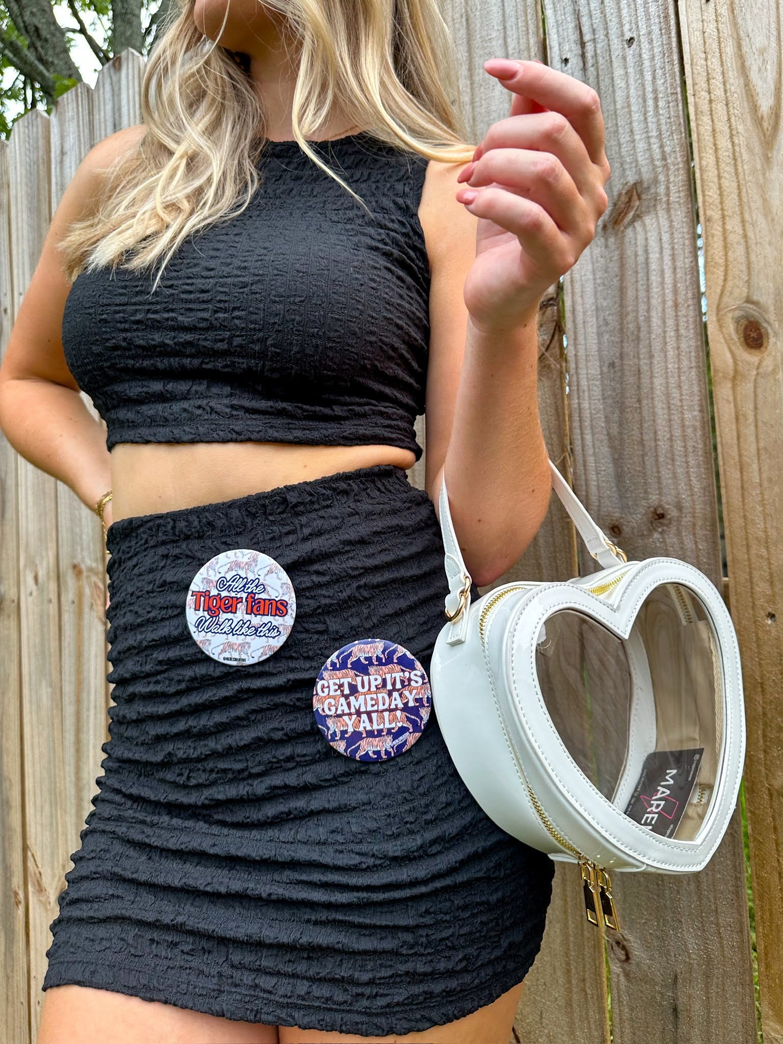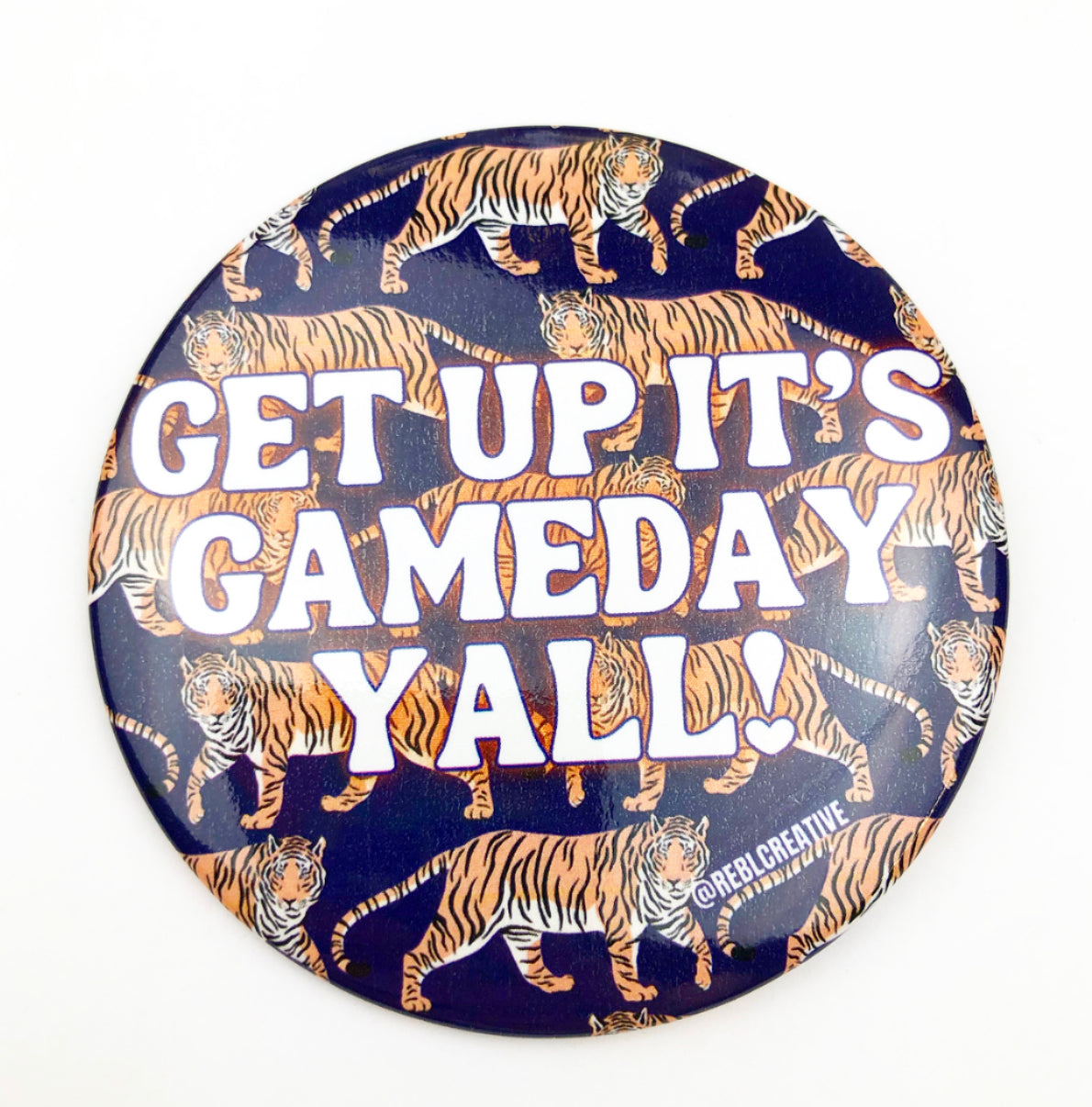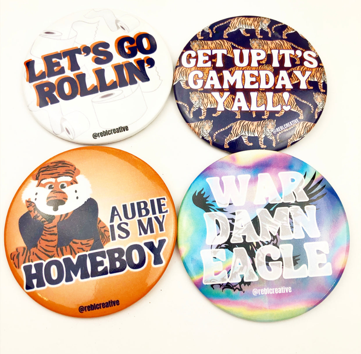 Each pin back button is 3 inches in diameter. These buttons are super lightweight and perfect for Game Day! Add to your outfit or a purse strap to complete your game day look. Each button is finished with a plastic coating to keep your button clean from any game day activities!