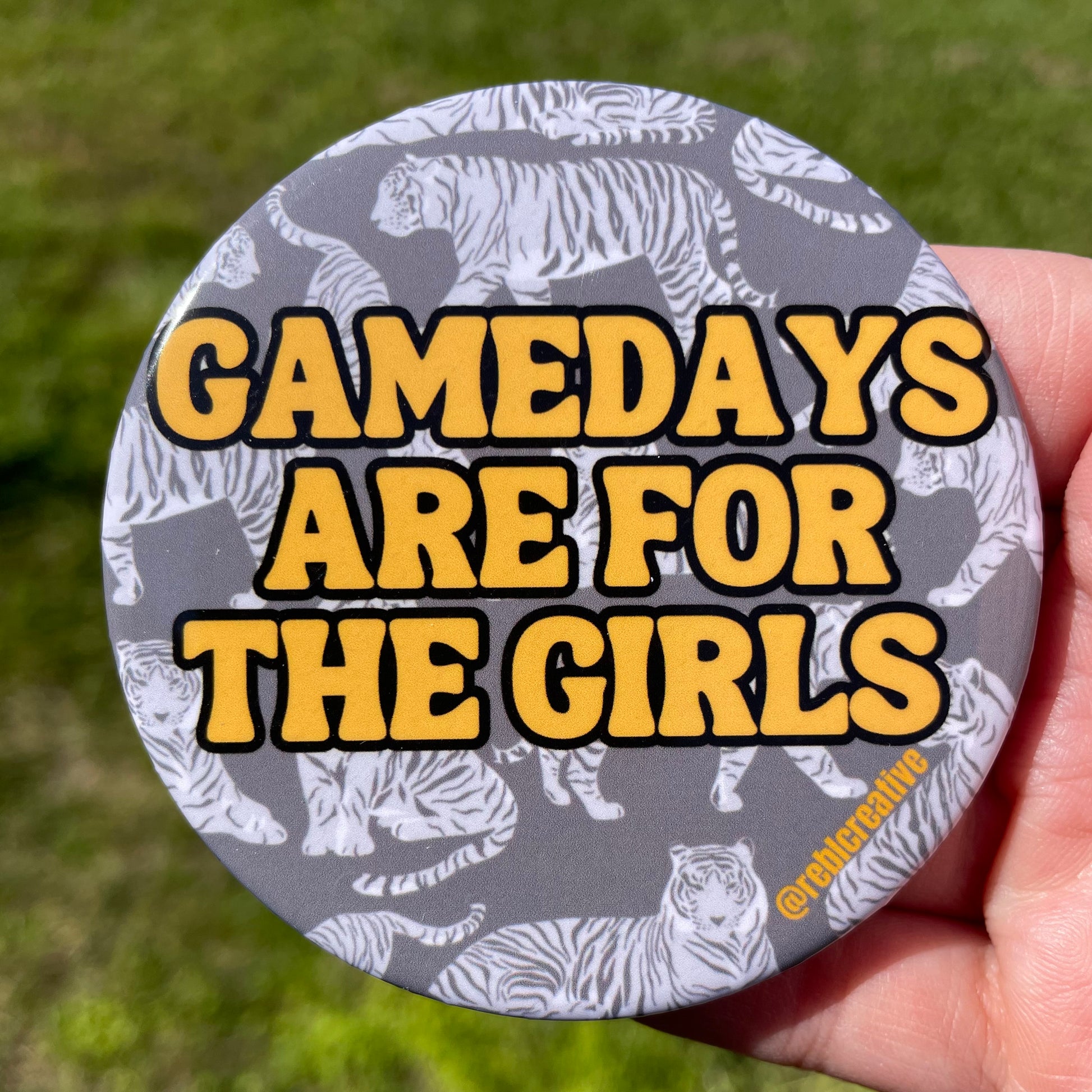 Each pin back button is 3 inches in diameter. These buttons are super lightweight and perfect for Game Day! Add to your outfit or a purse strap to complete your game day look. Each button is finished with a plastic coating to keep your button clean from any game day activities!