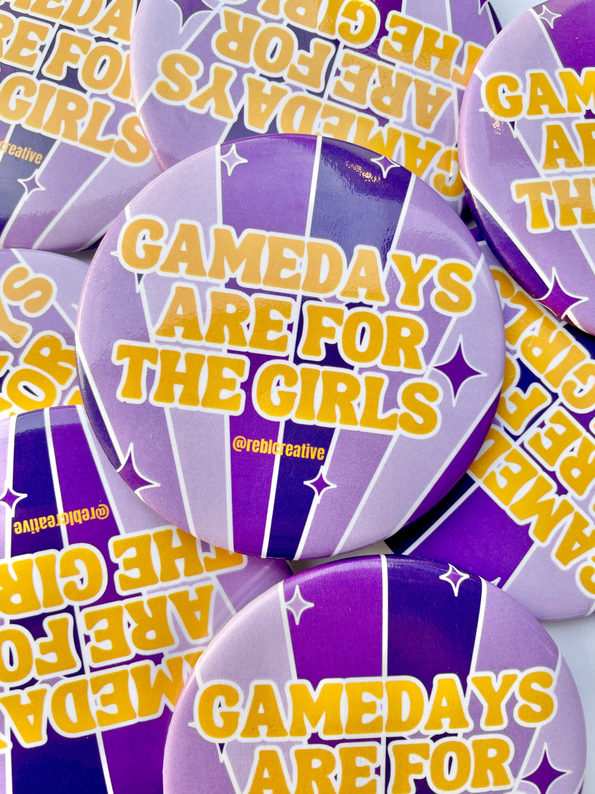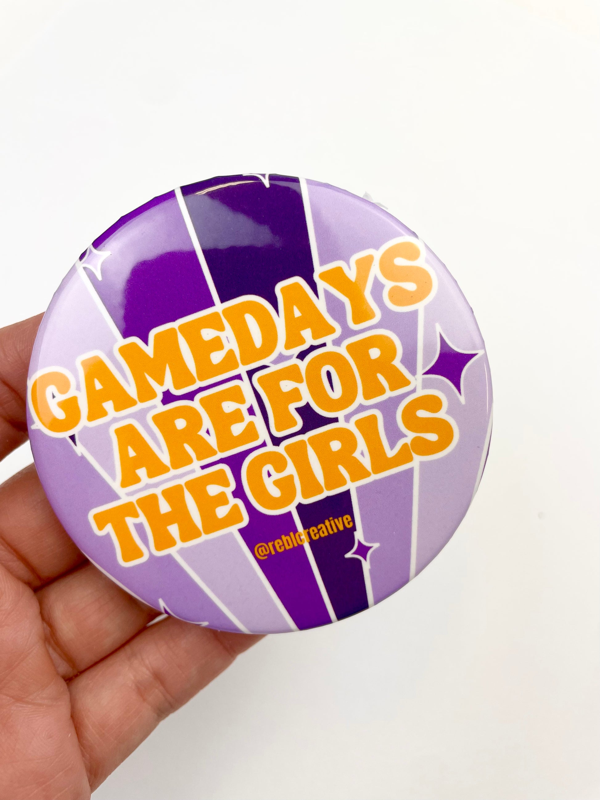 Each pin back button is 2.25 inches in diameter. These buttons are super lightweight and perfect for Game Day! Add to your outfit or a purse strap to complete your game day look. Each button is finished with a plastic coating to keep your button clean from any game day activities!