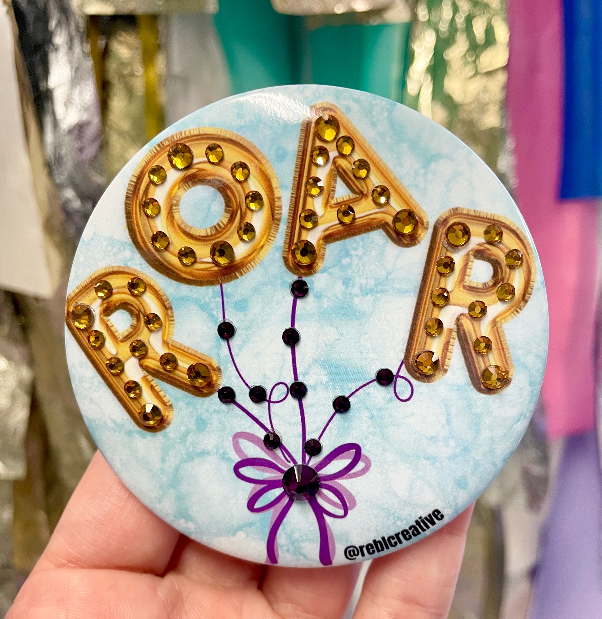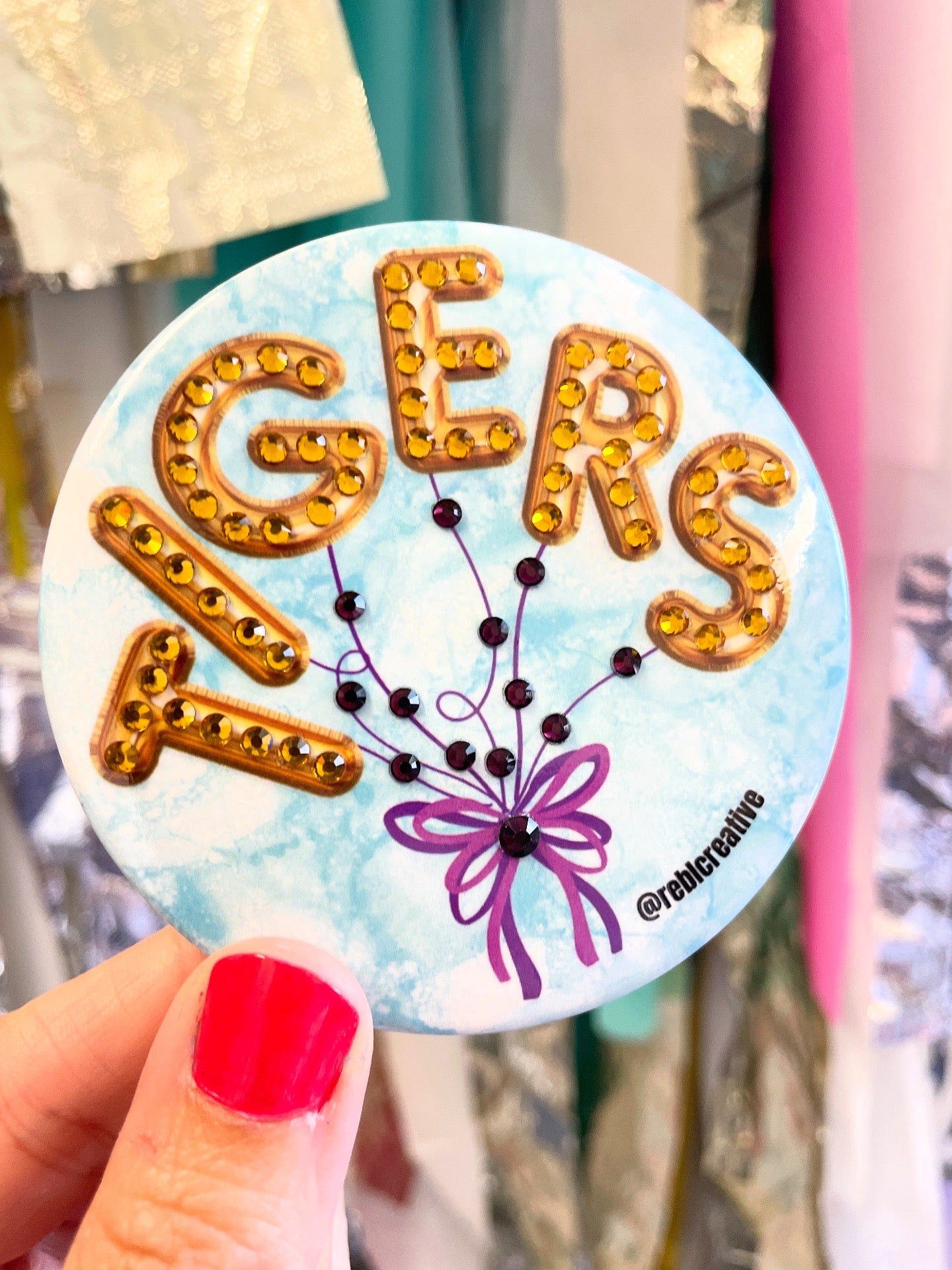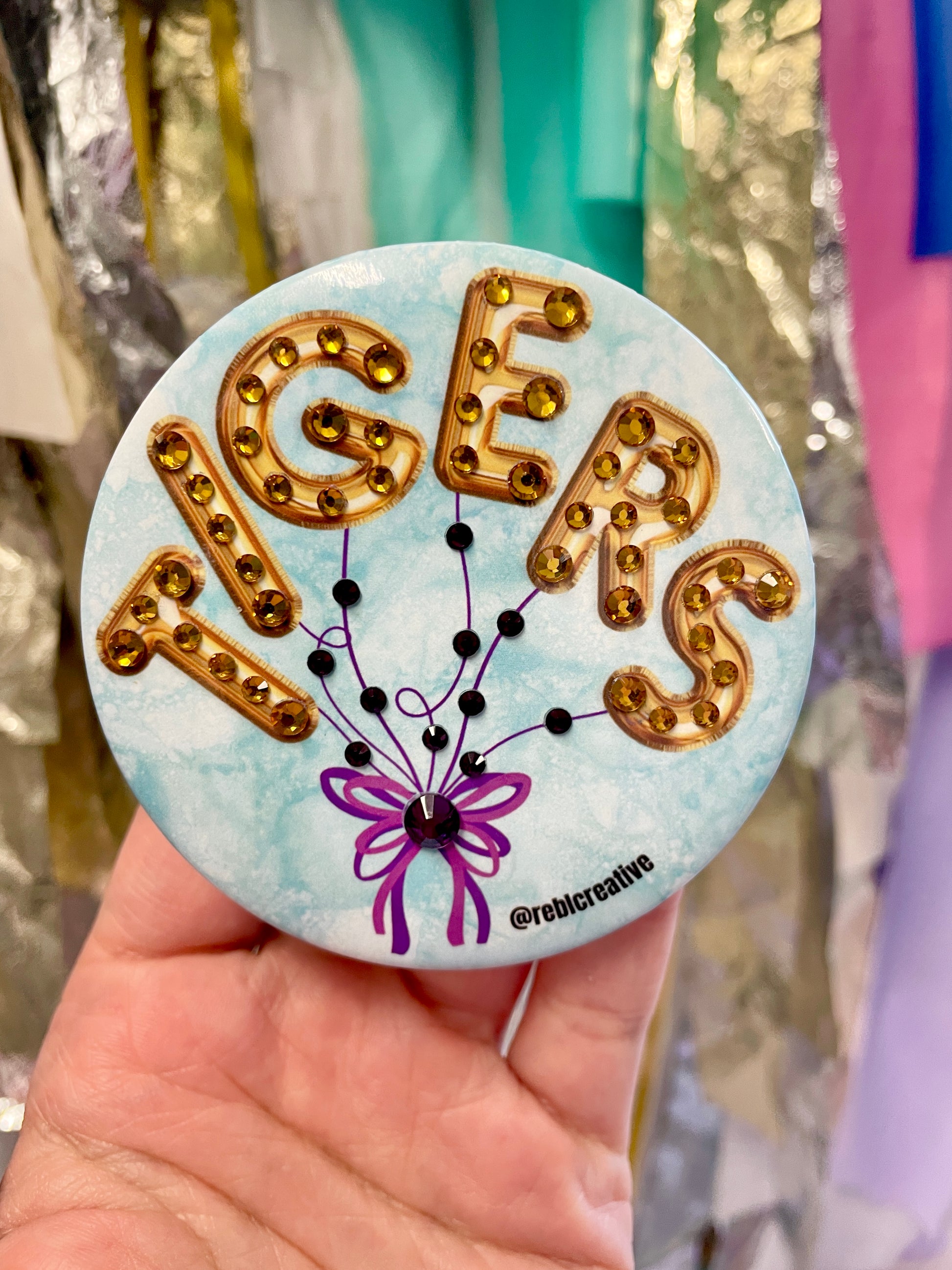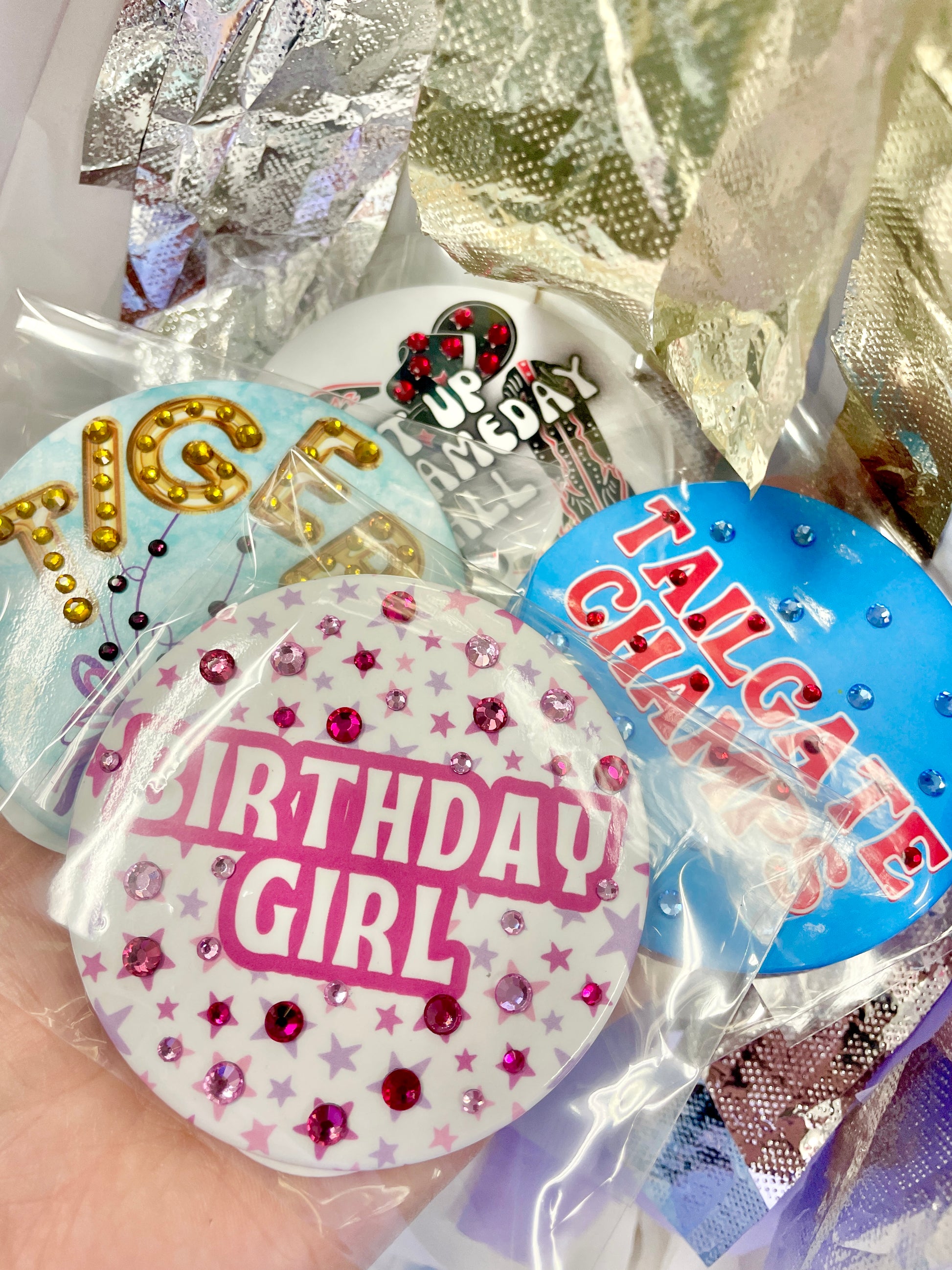 Each button measures 3 inches in diameter — the perfect size to pop on a jacket, purse strap, or favorite fit. Designed with fans in mind, they’re ultra-lightweight and easy to wear all day long. Rhinestones are heat sealed.