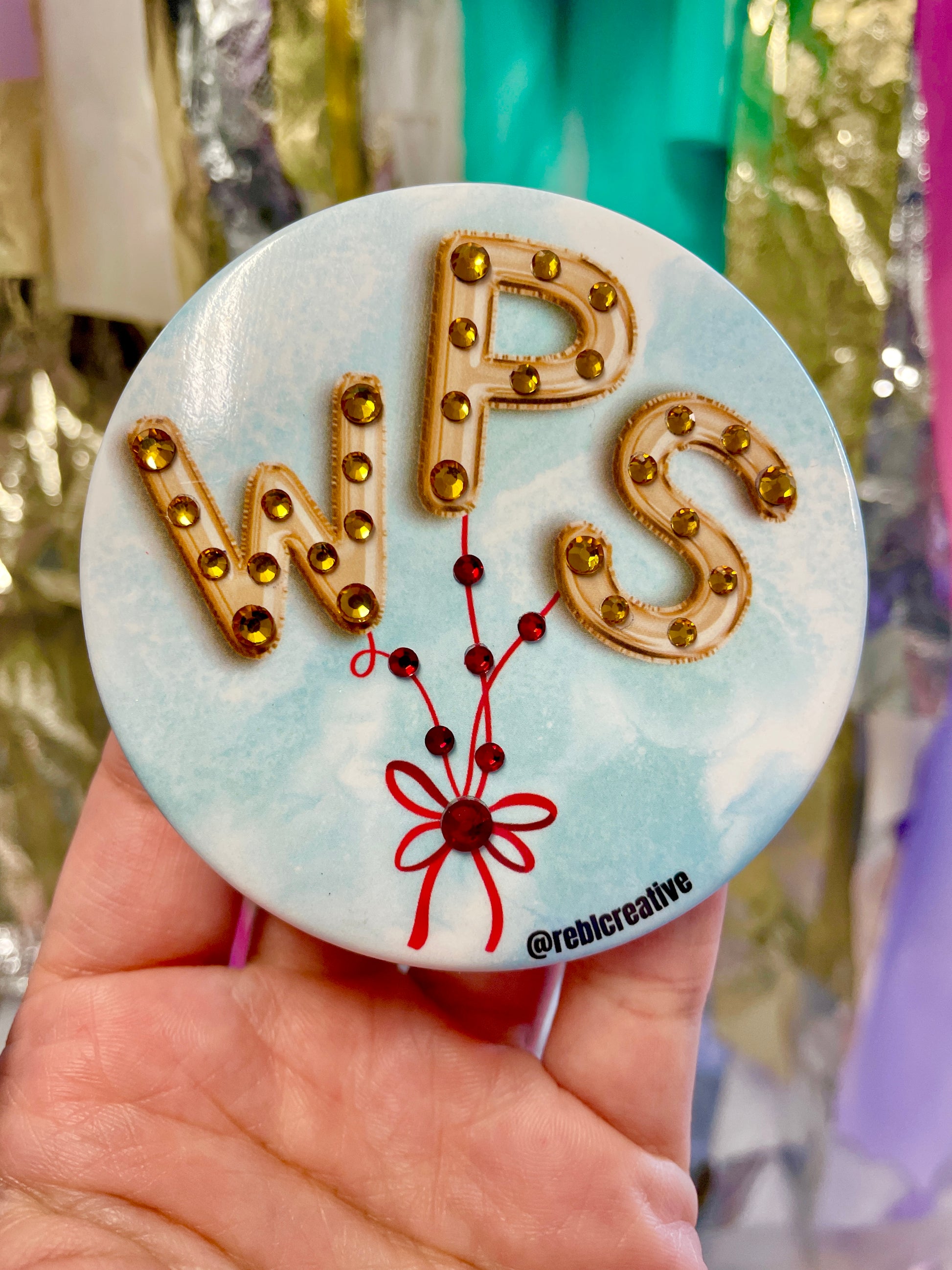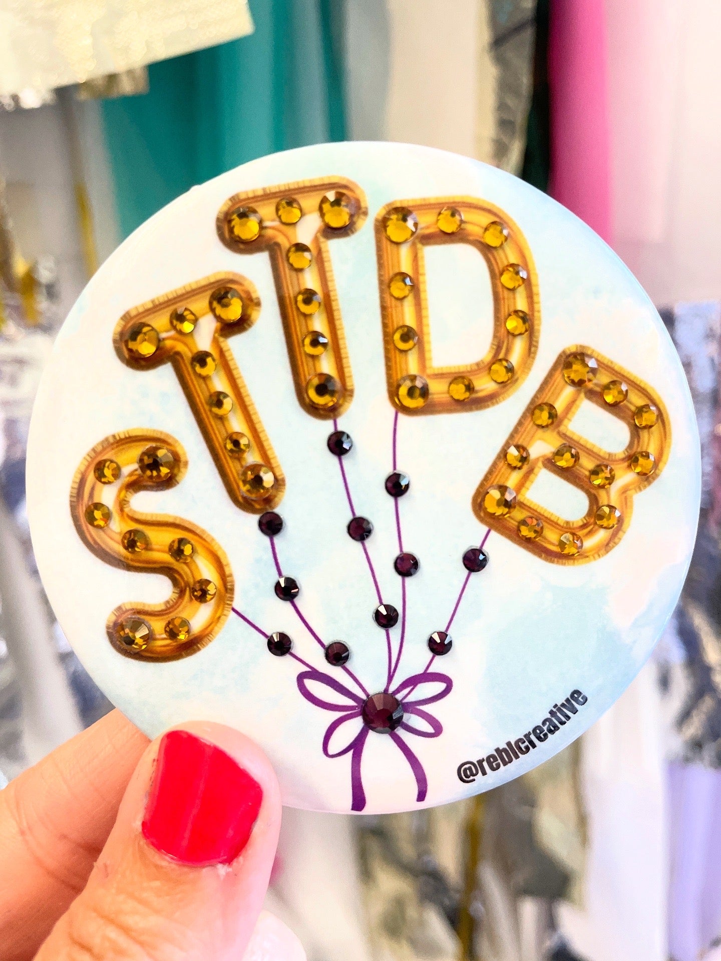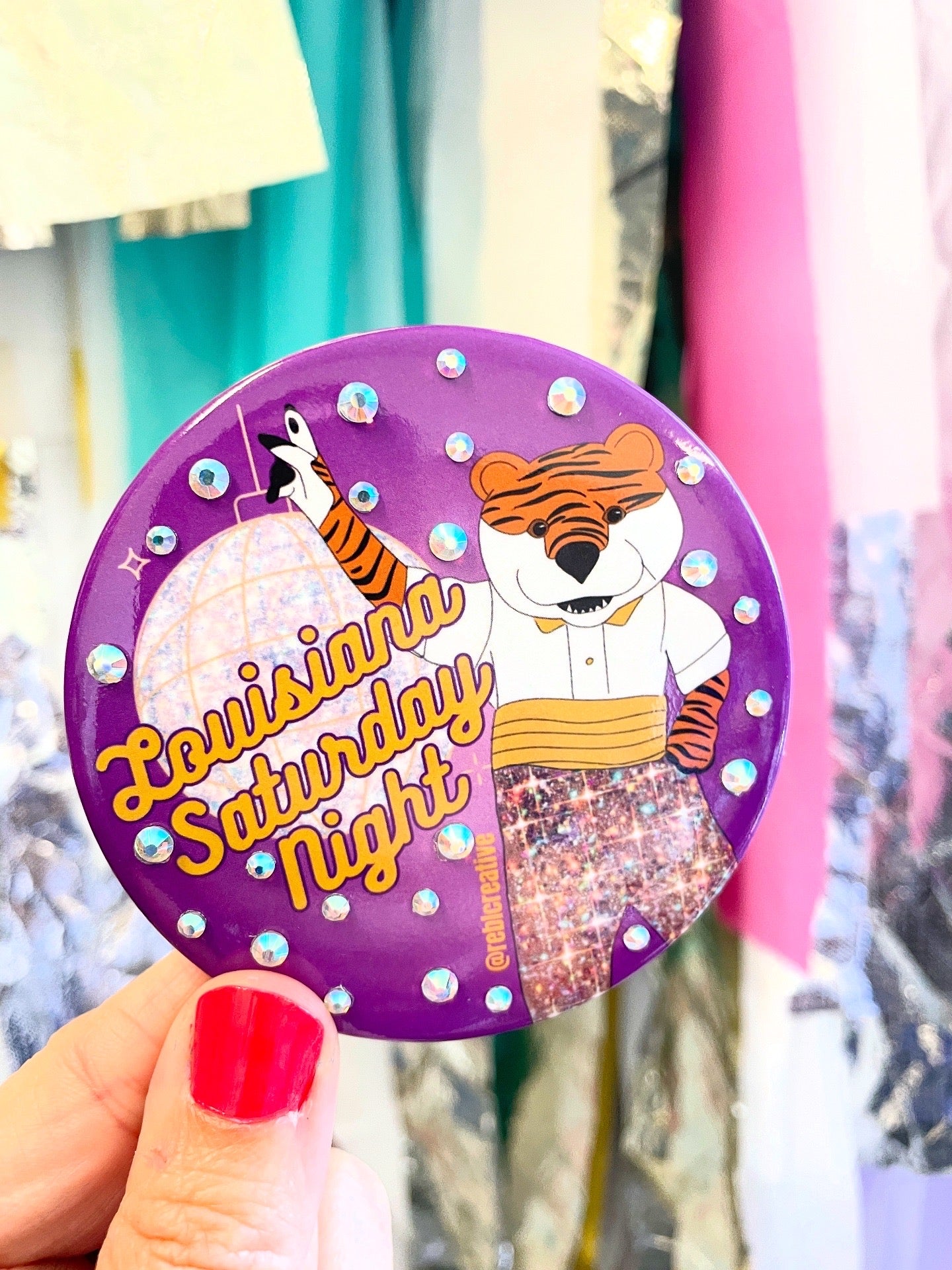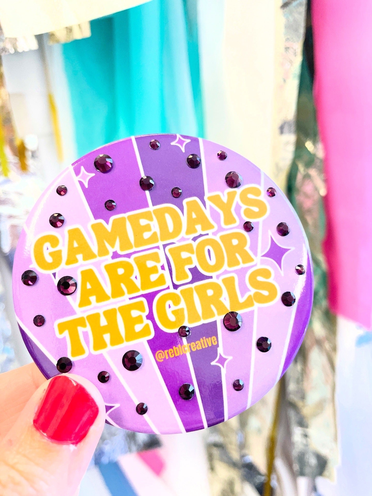 Each button measures 3 inches in diameter — the perfect size to pop on a jacket, purse strap, or favorite fit. Designed with fans in mind, they’re ultra-lightweight and easy to wear all day long. Rhinestones are heat sealed.