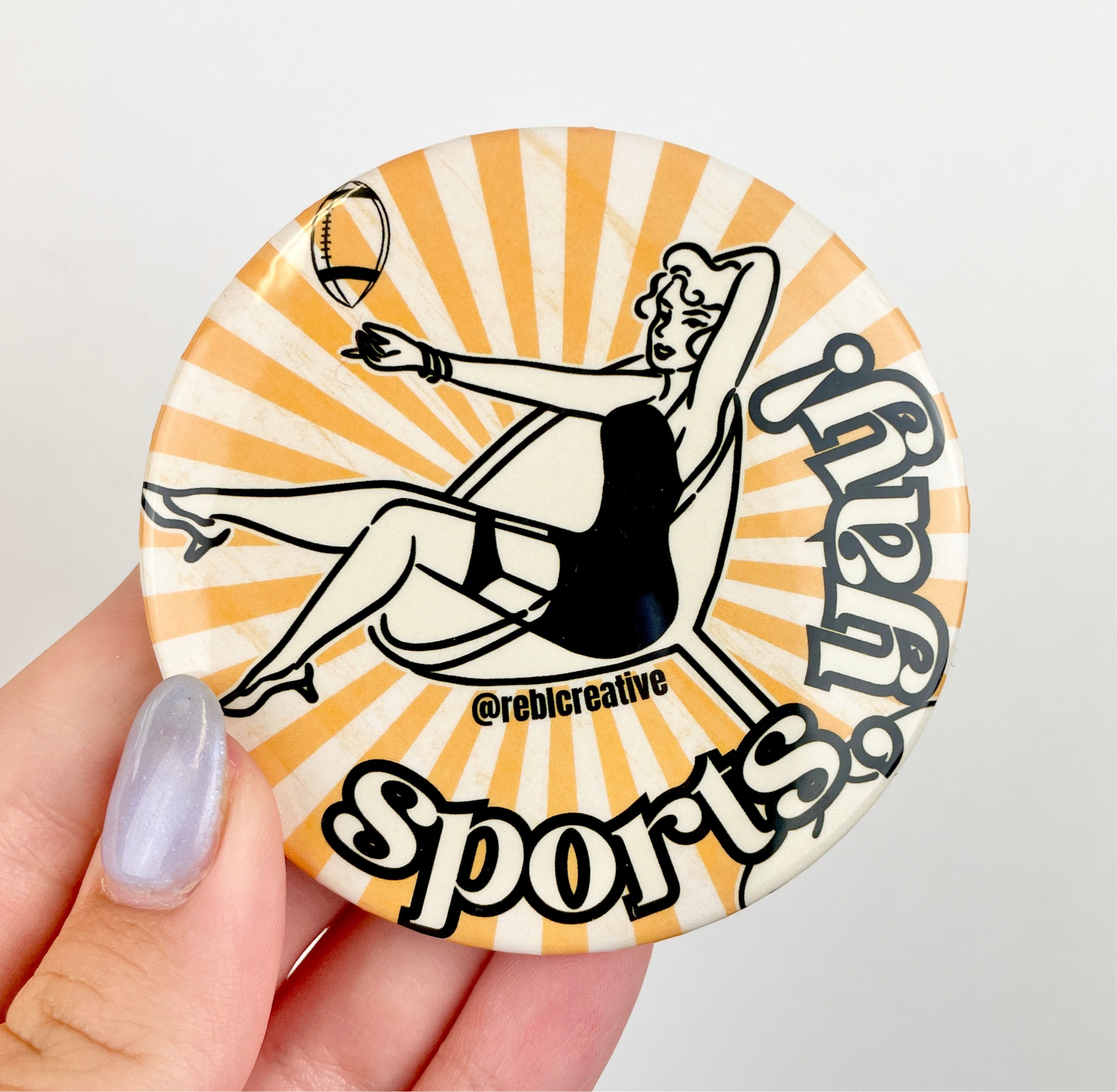 Each pin back button is 3 inches in diameter. These buttons are super lightweight and perfect for Game Day! Add to your outfit or a purse strap to complete your game day look. Each button is finished with a plastic coating to keep your button clean from any game day activities!