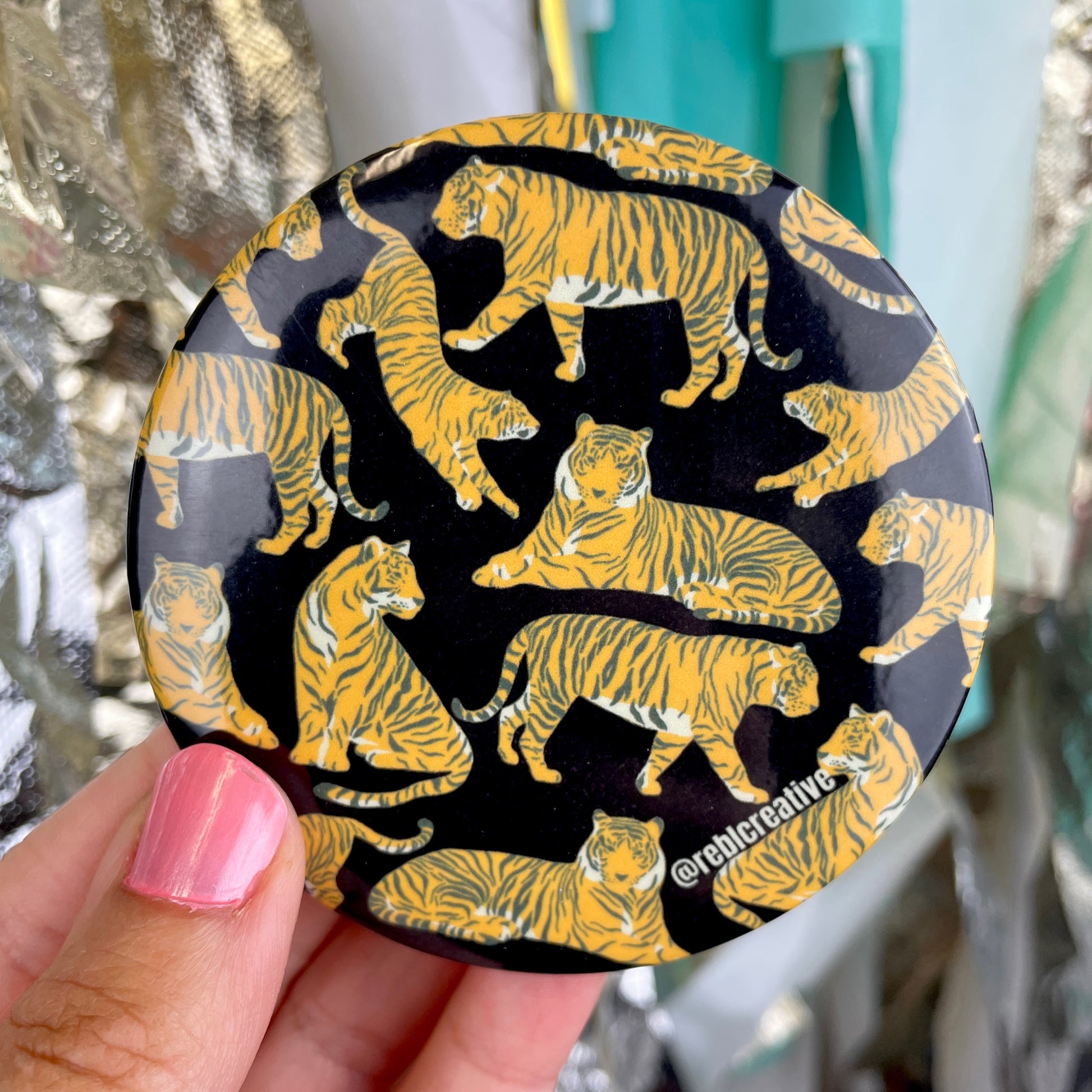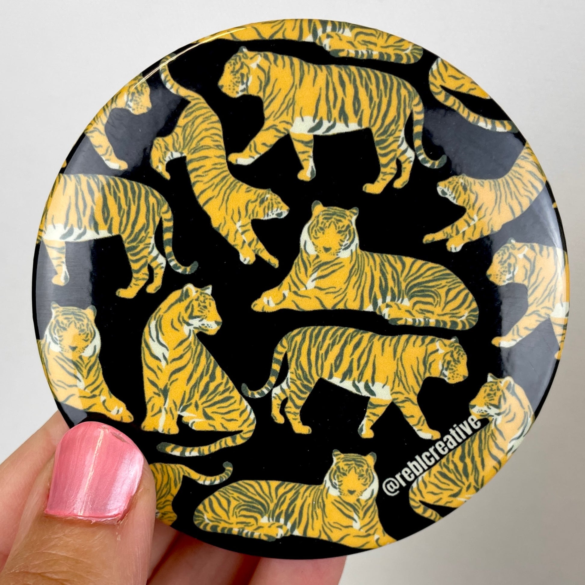 Each pin back button is 3 inches in diameter. These buttons are super lightweight and perfect for Game Day! Add to your outfit or a purse strap to complete your game day look. Each button is finished with a plastic coating to keep your button clean from any game day activities!