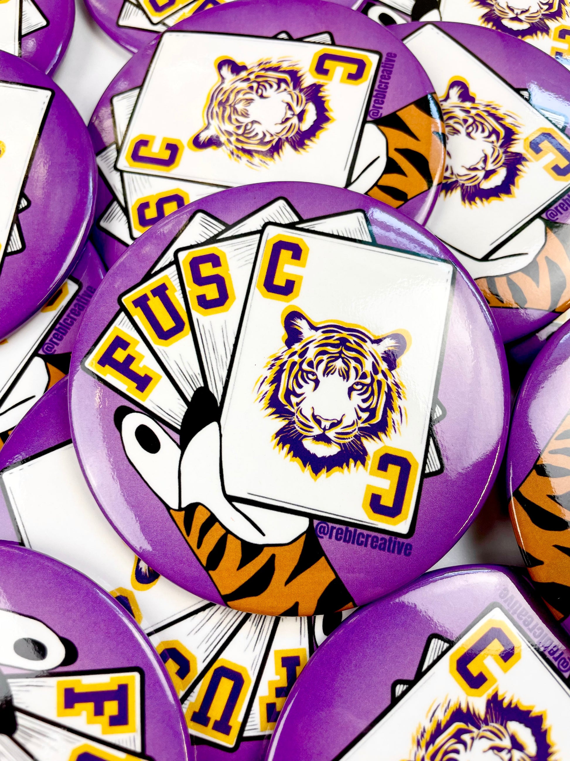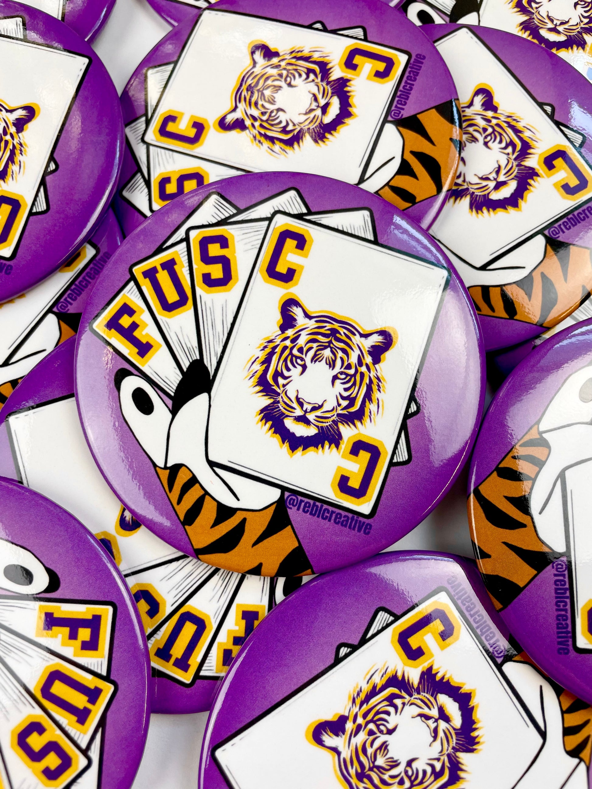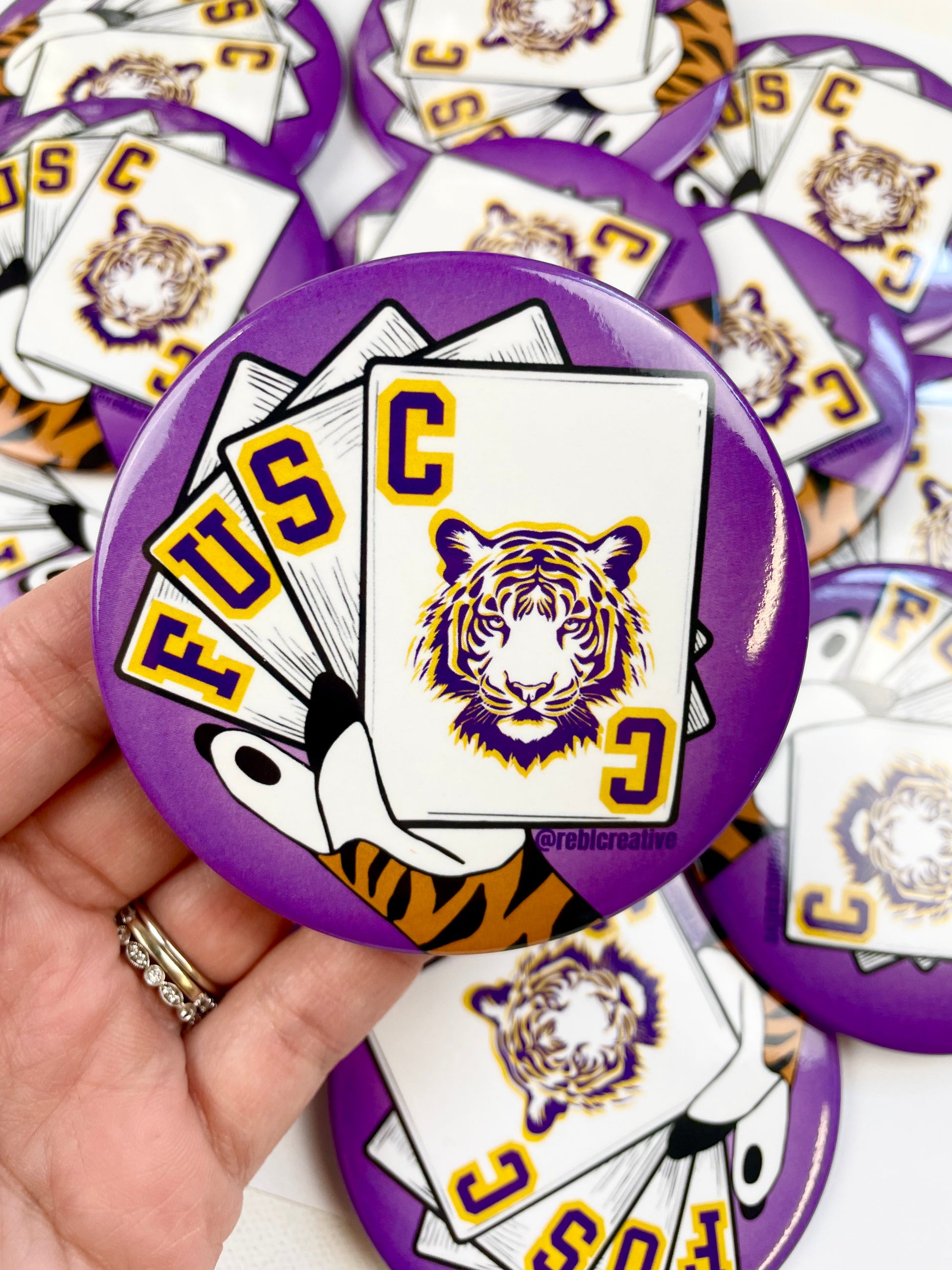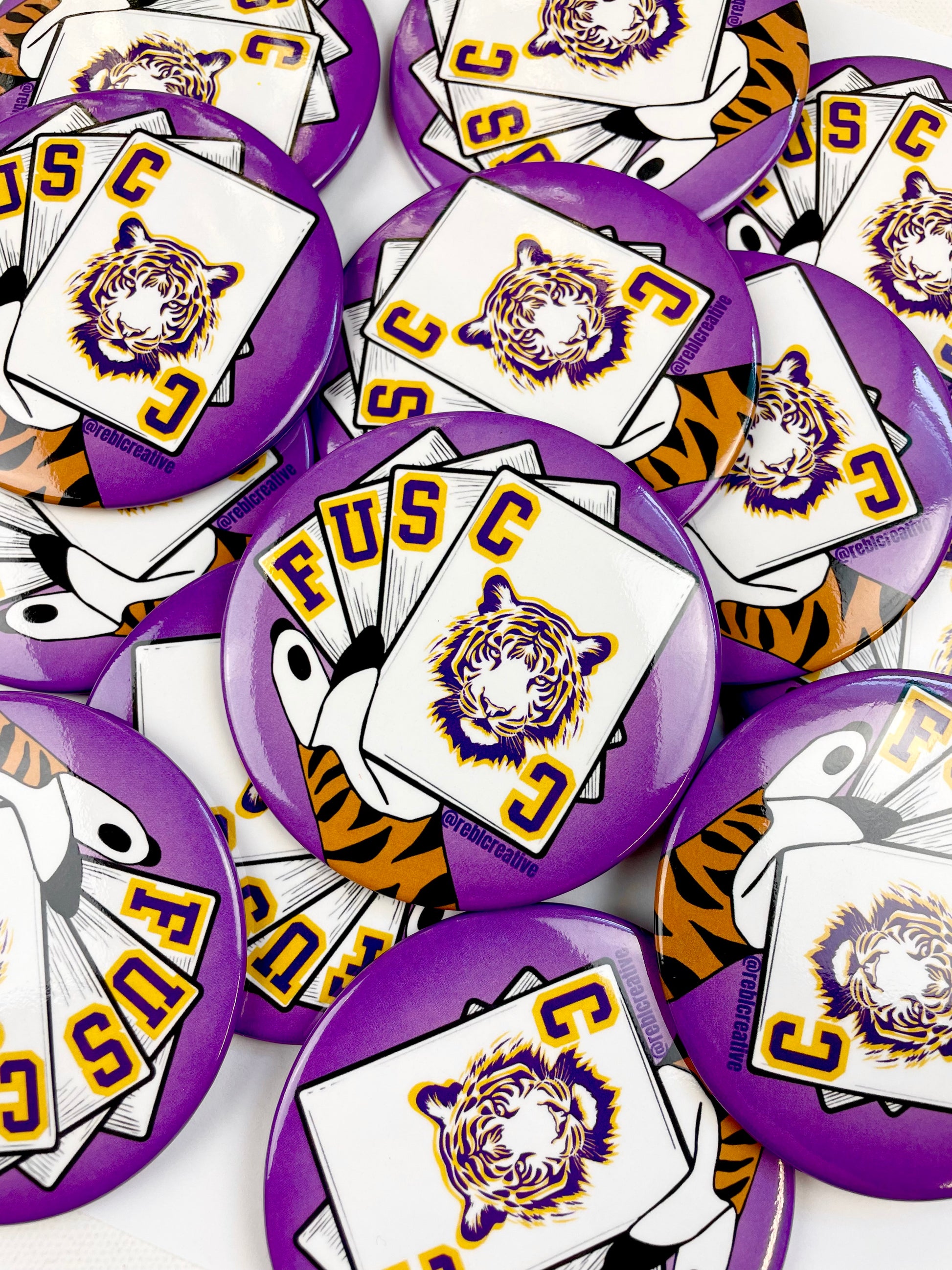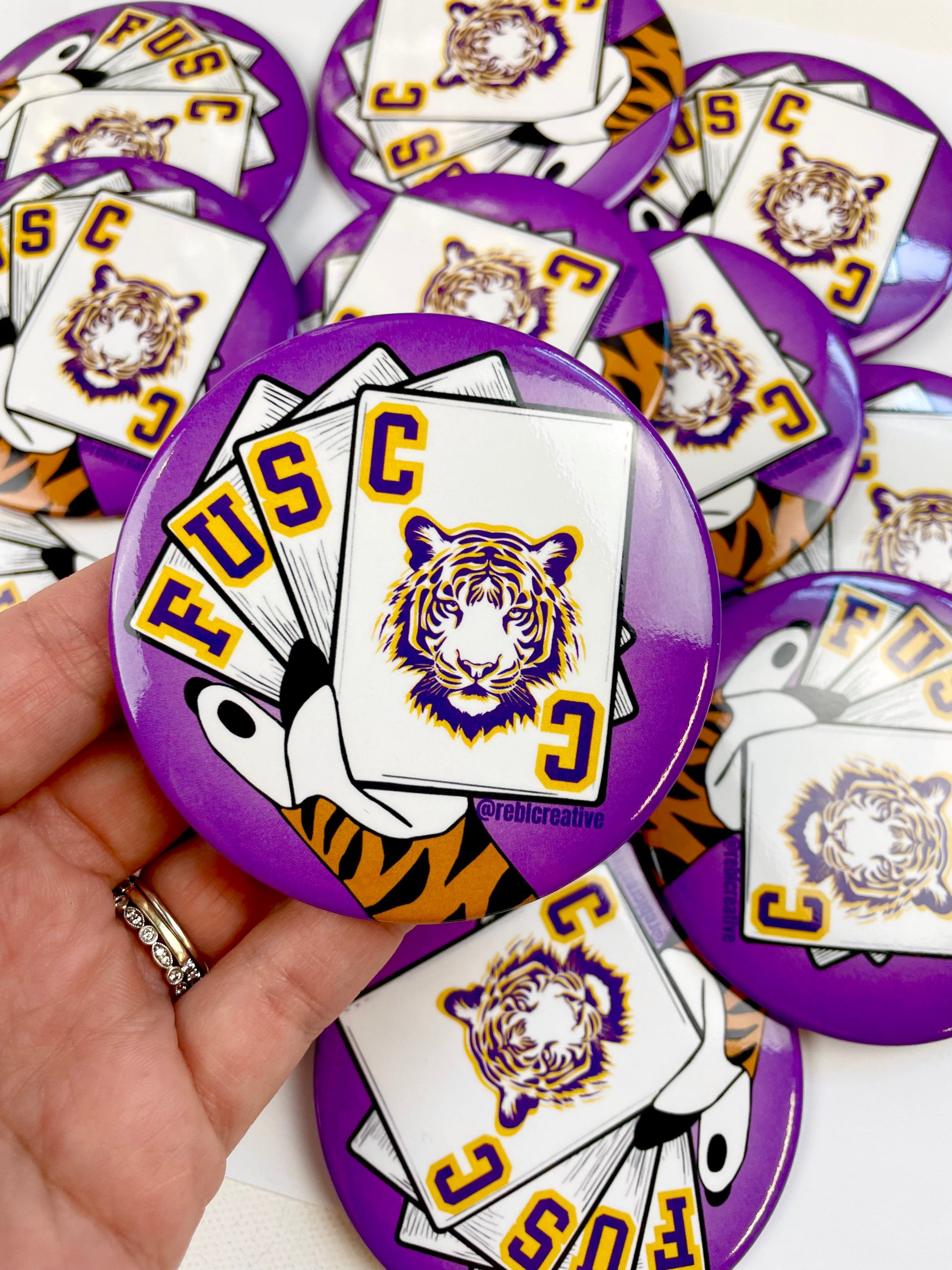 Each pin back button is 3 inches in diameter. These buttons are super lightweight and perfect for Game Day! Add to your outfit or a purse strap to complete your game day look. Each button is finished with a plastic coating to keep your button clean from any game day activities!